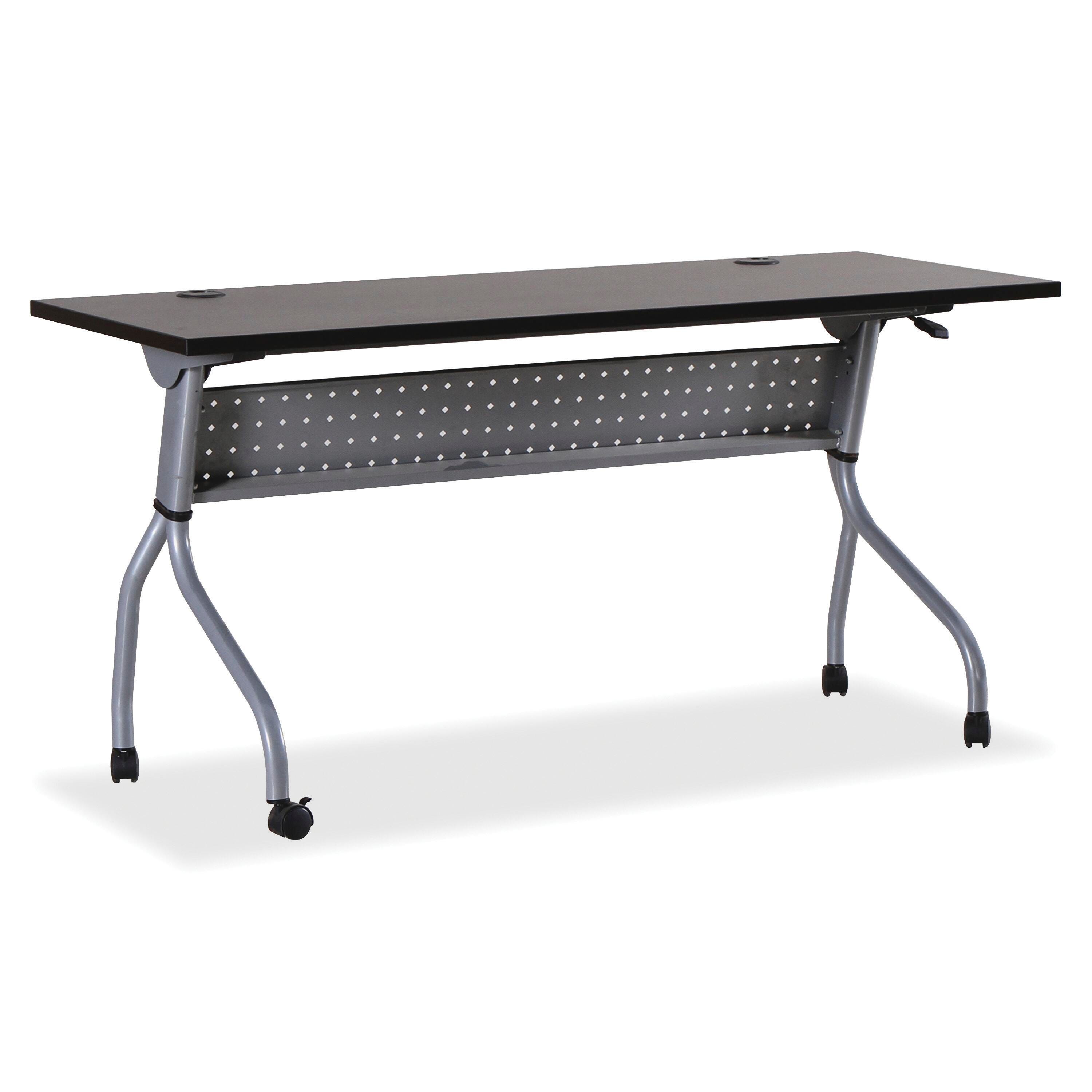 Lorell Espresso/Silver Versatile training table offers flexible configurations and convenient storage. Use individually or secure together into rows with a reliable metal connector (sold separately). Top flips up for easy storage without having to remove the connector. Top features a melamine surface with a 3 mm PVC straight edge. Two grommets allow easy cord management. Four-leg, all-metal base features a one-way fold and modesty panel. Table rolls easily on four nylon casters with brakes.