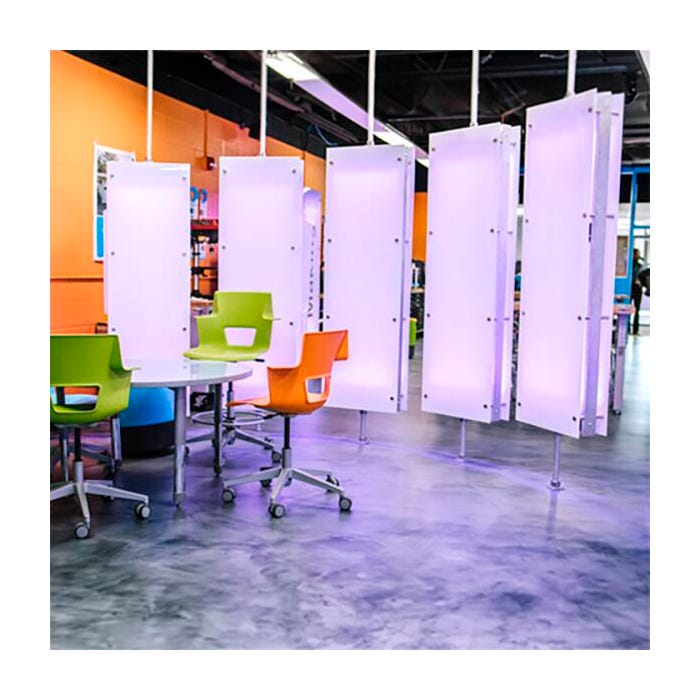 This double-sided, dry-erase light panel by Inventionland is great for STEM/STEAM labs, your art department, classrooms, or informal spaces. Every brainstorming area should have at least one. These panels change color and contain multi-colored LED lights that can be controlled remotely or by an Android tablet with an installed app (compatible with Alexa and Google Assistant). It’s easy to install and plugs into a standard 110-120V wall outlet!Features