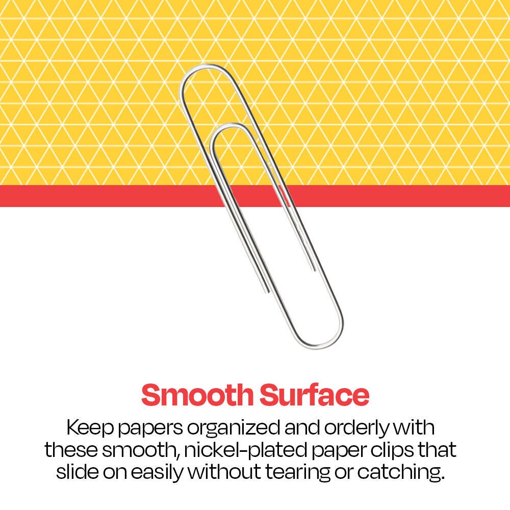 This large pack of Smooth Paper Clips from School Smart offers simple organization at great value! These paper clips have a nickel finish to resist corrosion and provide a smooth surface that doesn't snag your documents. Each nickel-plated smooth steel clip measures 2 inches. This pack delivers 100 paper clips for filing, grading, organizing, and more.