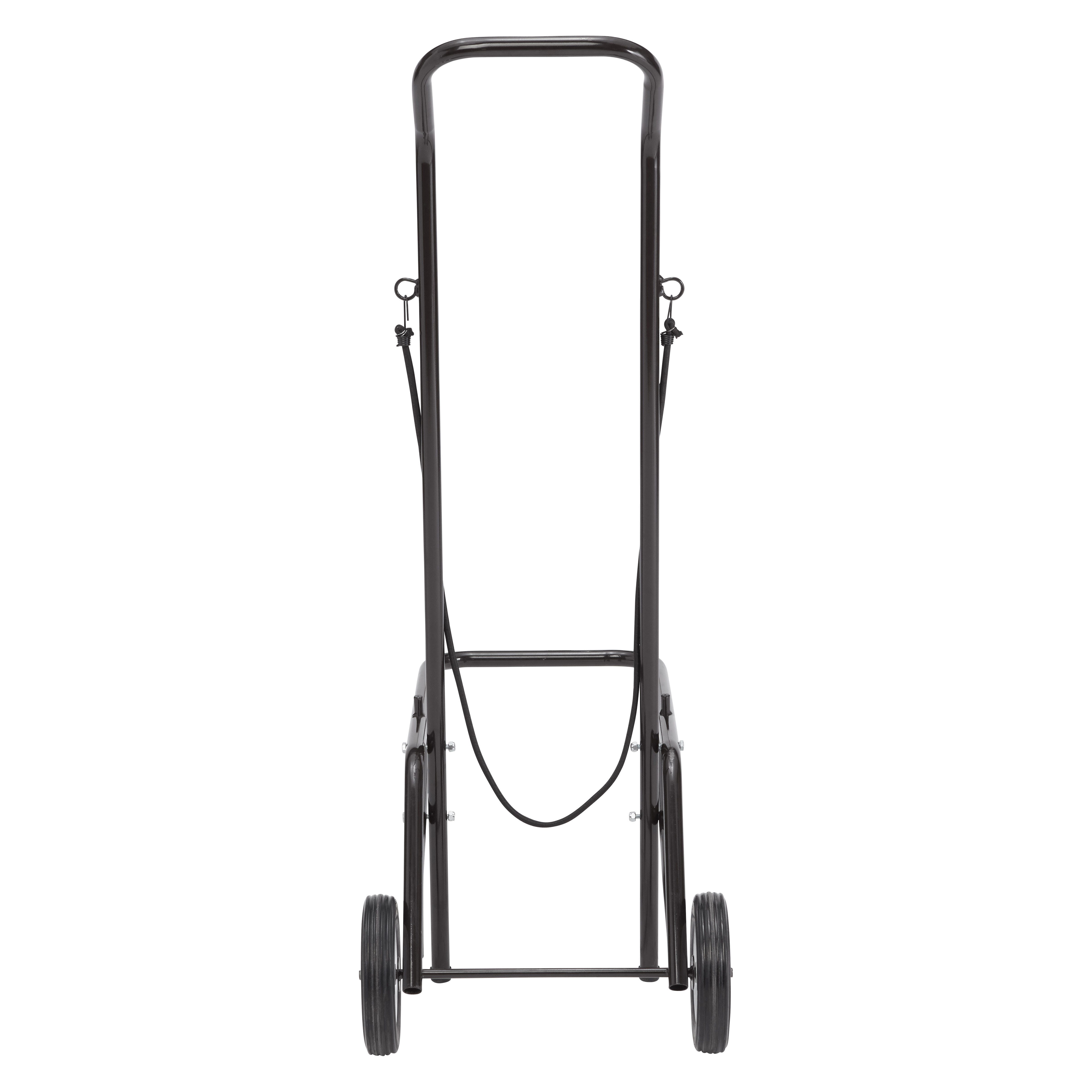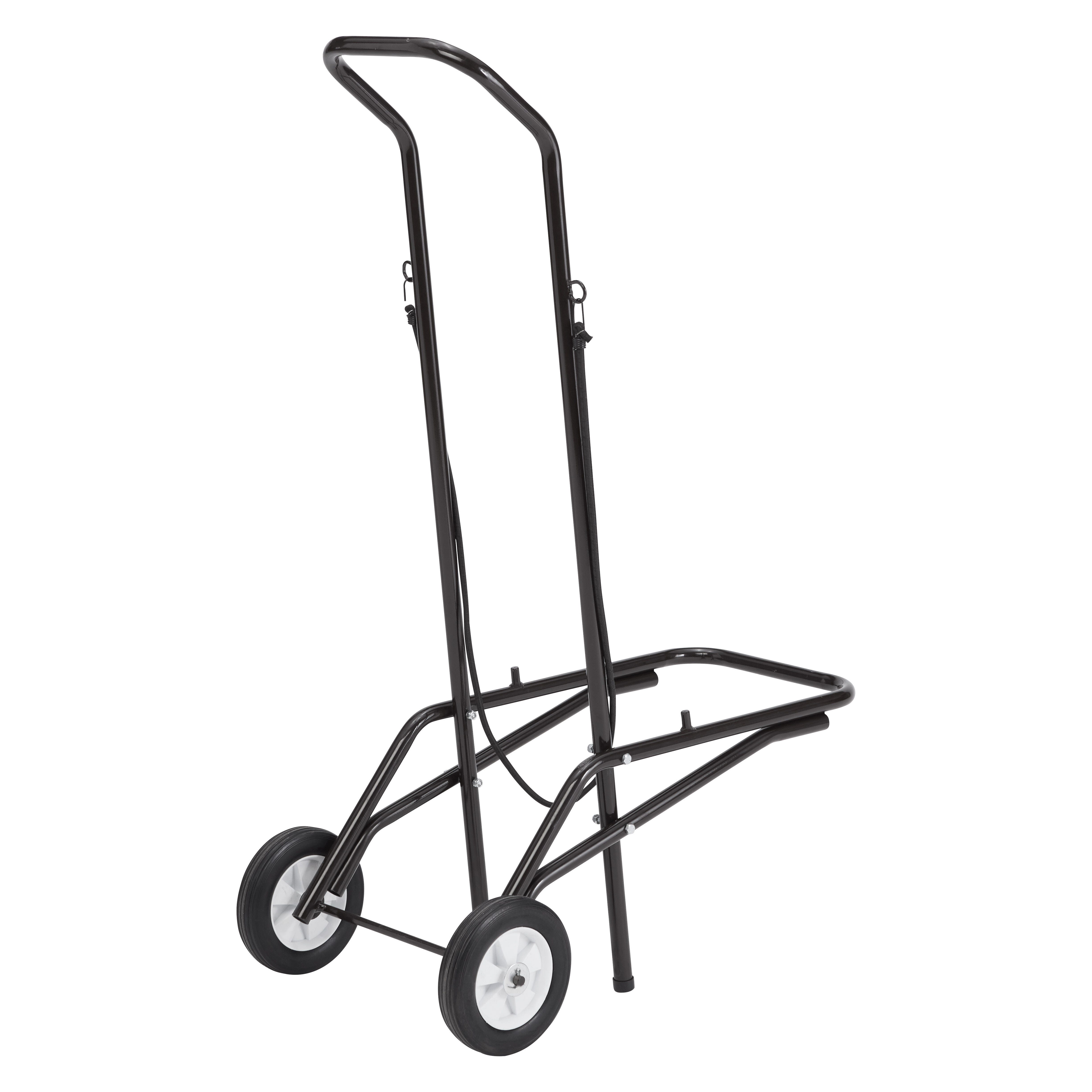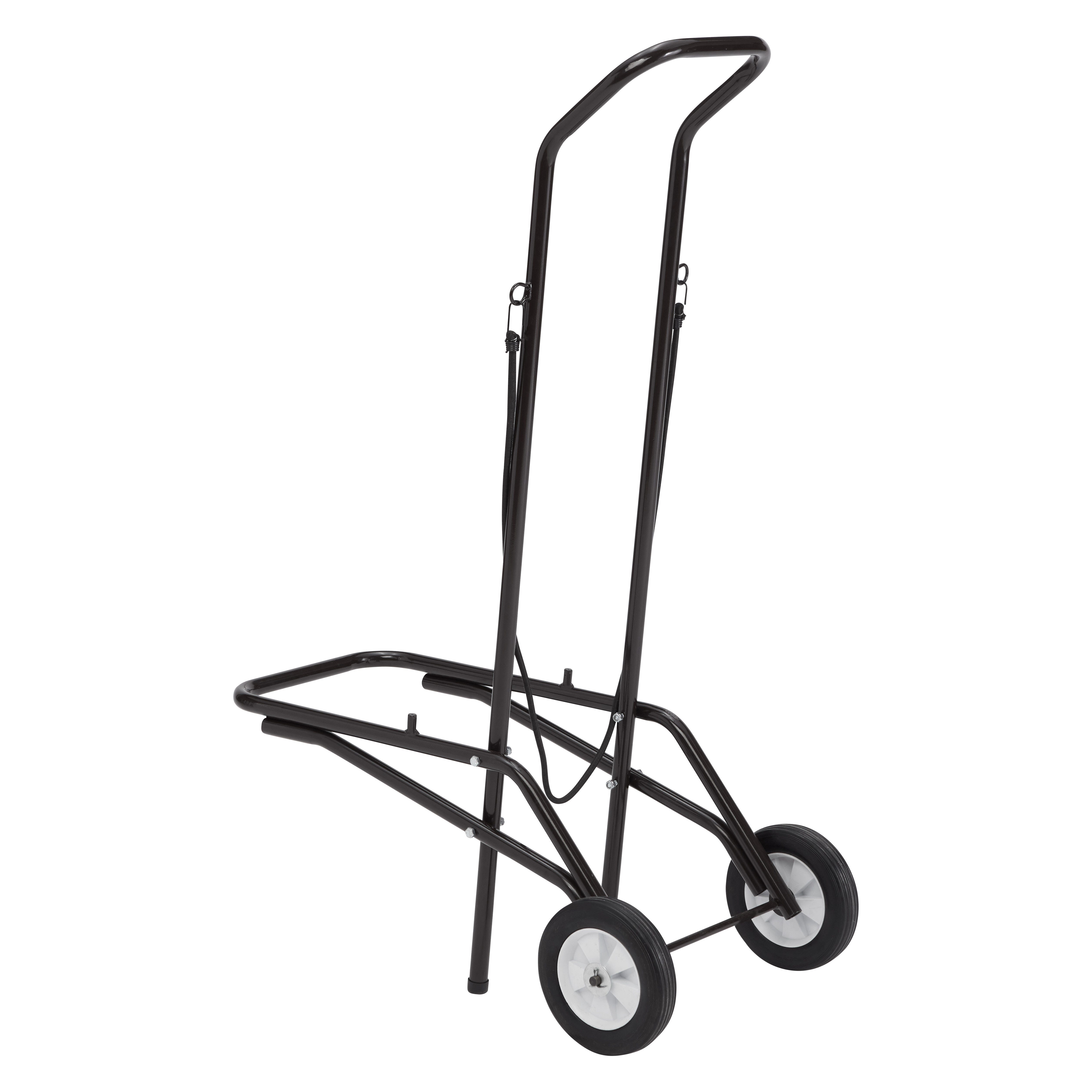 This folding chair cart is made for your small, dynamic space and is designed to transport up to twelve folding chairs. Perfect for small classrooms and office spaces, this dolly stores and transports using a small, two-wheel footprint ideal for places with minimal storage space. Use included bungie cord to ensure chairs stay on the dolly when stored or in transport. Minimal assembly required - simply attach handle to the base and use the included hardware to secure. Chairs not included.