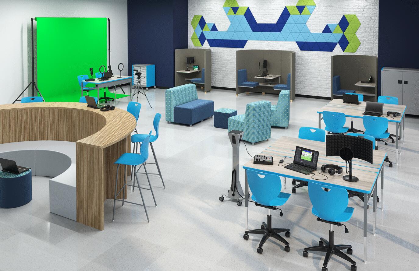 Whether you are creating a dedicated lab for a single show or need a flexible, multi-purpose solution for your video and podcasting space, a well-equipped Career Technical Education (CTE) area designed to support the next big show can encourage innovation while developing college and career skills. Solutions like tables of varied shapes and heights with storage underneath to house materials and tools will help give students the tools they need to explore their interests, nurture their skills, and prepare for the future.