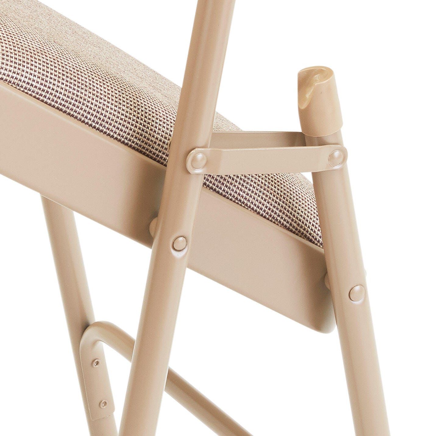 While these fold-out chairs come in muted beige, their elevated comfort will make your jaw drop! Designed for public spaces like auditoriums, recreational centers, educational spaces, and beyond, it features non-marring glides to move smoothly and effortlessly. Chair includes double contoured back, double hinges, double riveted ''U'' shaped cross braces and ''V'' tip stability caps. Chair features 1-1/4 inch upholstery that covers the entire riveted seat and back. Comes with Cafe Beige fabric and beige frame. Total chair measures 18-3/4 W x 20-1/4 D x 8-3/4 H inches. Seat dimensions measure 16 W x 16 D x 17-3/4 H inches.Features