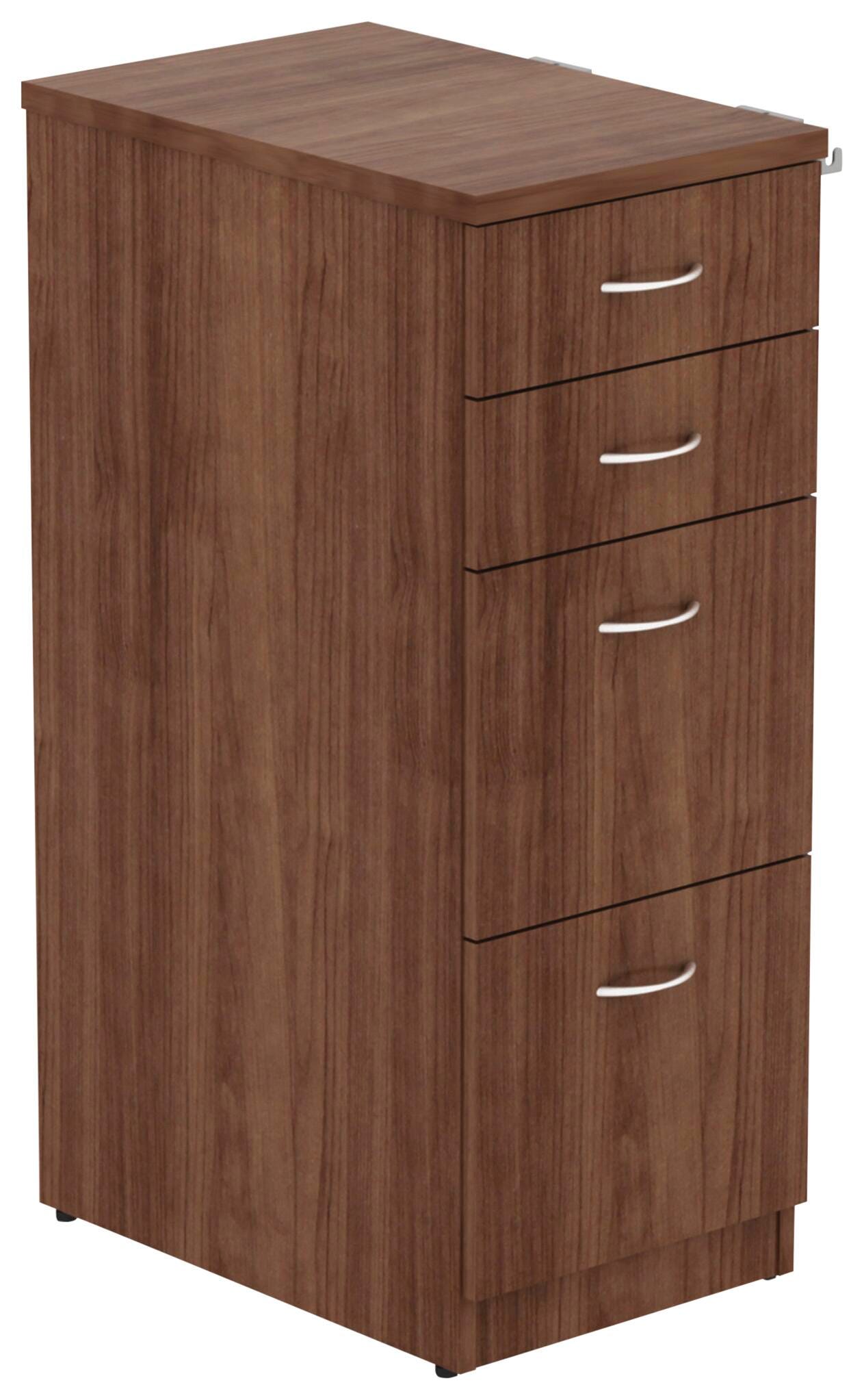 Four-drawer file cabinet is part of the Lorell Relevance Series, versatile and stylish office furniture that configures to meet your needs. Walnut laminate exterior matches other units in the series for a cohesive, professional look. Cabinet with silver pulls includes two box drawers and two file drawers to maximize storage and filing space. It cannot be used freestanding and needs a worksurface to sit on the top. It is made with a side metal frame for durability. Adjustable leveling feet help keep the file cabinet even on uneven surfaces.