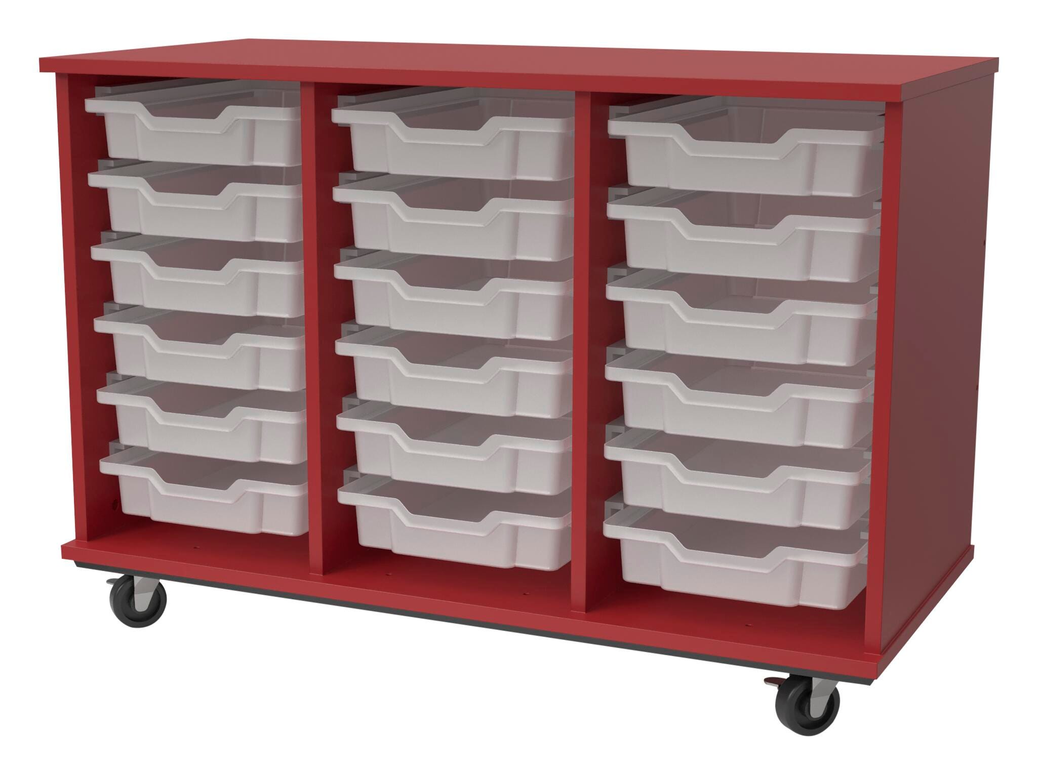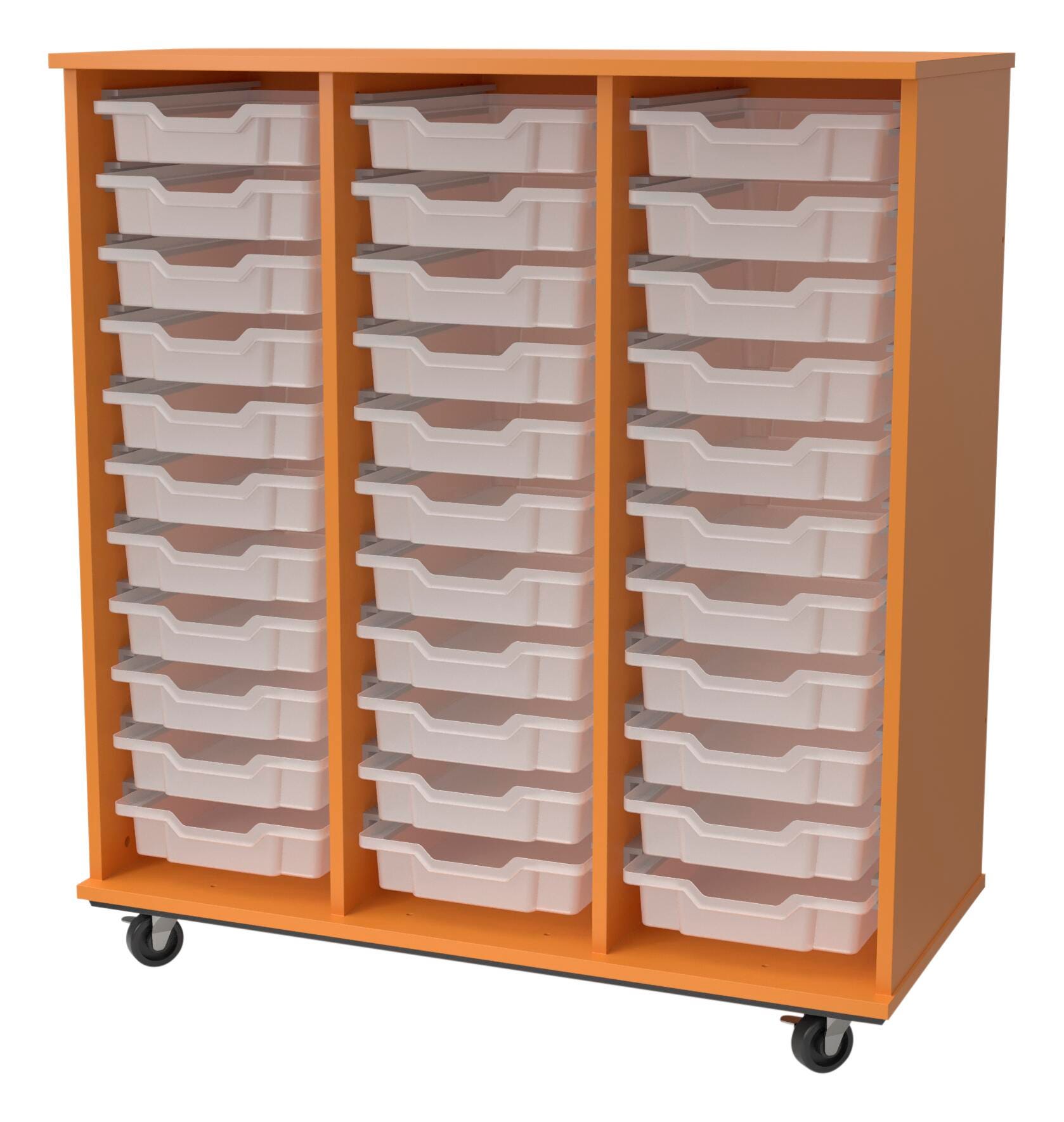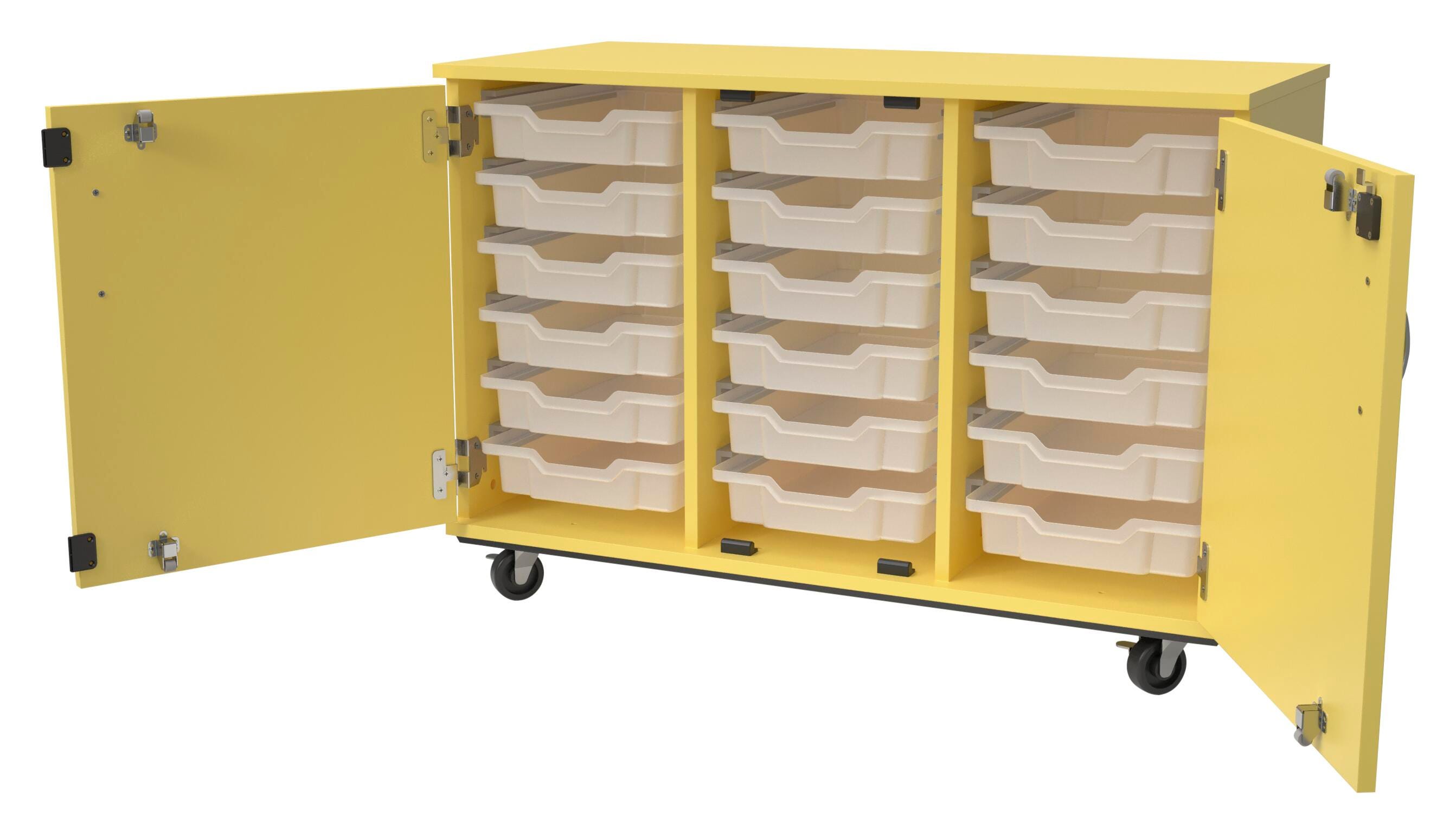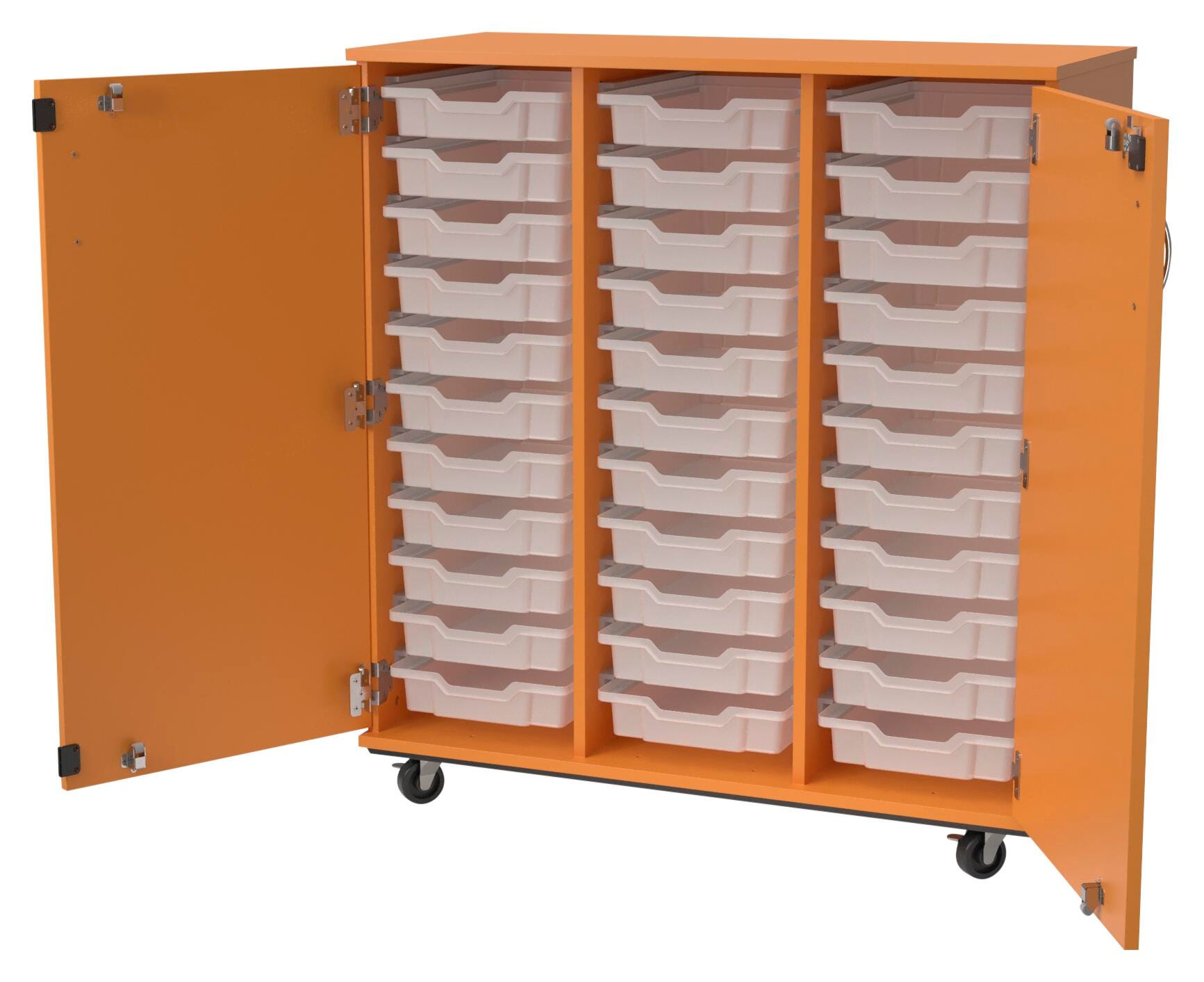 A pop of bright color meets complete organization with the Classroom Select Expanse Mobile Cabinet! The Expanse storage tote cabinets is made with durable 3/4-inch particle board with double-sided thermal fused laminate and matching 3mm PVC edge banding. These storage cabinets come with locking doors that are 3/4 inch double-sided TFL and matching 3mm PVC edge banding. Shelves are double-sided HPL with matching 3mm PVC edge banding on the front edge and are adjustable. The cabinet has four 3-inch heavy-duty locking casters to keep items safe when not in use. Choose from several colors or finishes to best fit your space: Dark Elm, Dark Walnut, Graphite Nebula, Island, Light Oak, Maple, Medium Cherry, Natural Elm, Ocean, Orange. Red. Roman. Walnut. Royal Blue, or Yellow. Tote trays are 3 inches and are interchangeable with our Concord, Advocate Series, and Geode Series desks. Fully assembled for your convenience.