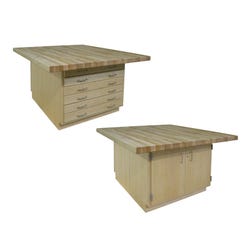 Our art series workstations serve as great project centers providing both a large, sturdy work surface as well as a variety of storage options. The base consists of two cabinets placed back-to-back. The cabinets are built using heavy-duty, solid hard maple face frame construction. The reinforced hard maple top measures 64 x 54 x 2-1/4 inches and overhangs the base by roughly 9 inches on all sides allowing for seating around the entire perimeter of the workstation. One side of this workstation features a 6-drawer cabinet for paper and tool storage. Each drawer measures 31 W x 23 D x 1-3/4 H inches (I.D.). On the opposite side of the unit is a double-door cabinet with an adjustable shelf for flexible storage of larger project items. Overall height is 33-1/4 inches.Features