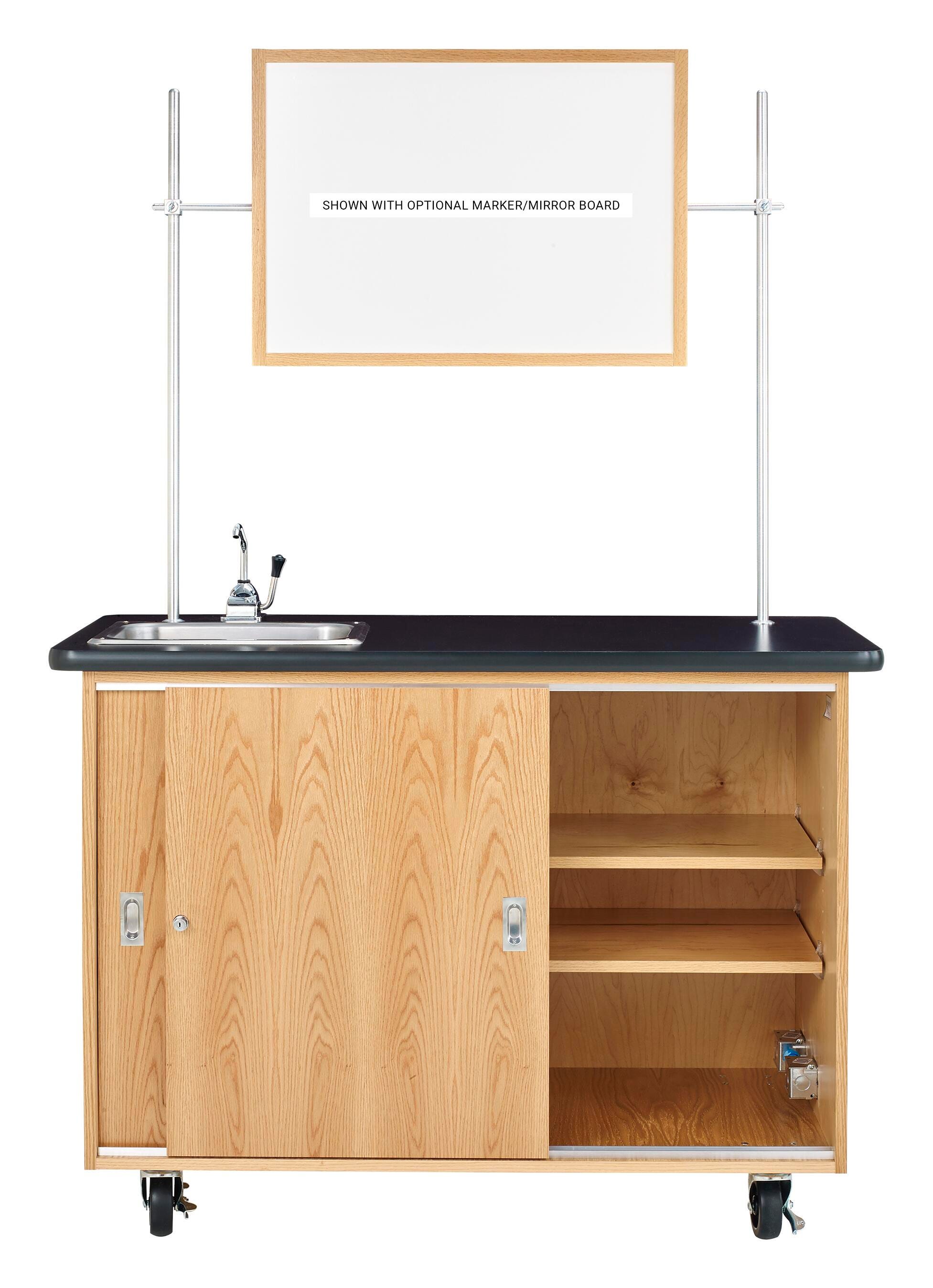 Diversified Woodcrafts Economy Mobile Science Lab Table measuring 48 x 24 x 36 inches and is fitted with a stainless steel sink, hand pump, heavy-duty 4 inch locking swivel casters, 25 foot grounded extension cord, two 2-1/2 gallon water bottles, connecting hoses, two 3/4 inch diameter upright rods, one 1/2 inch diameter crossbar with clamps, two fully adjustable shelves and a GFI protected AC duplex electrical outlet. Table with a mobile capacity of 500 lb is constructed from select oak and oak veneers with a chemical resistant and earth-friendly UV finish. Edges of the 1-1/4 inch thick high-pressure laminated top are bound with a plastic-T molding. It is rendered with unbreakable aluminum sliding door glides and lock.