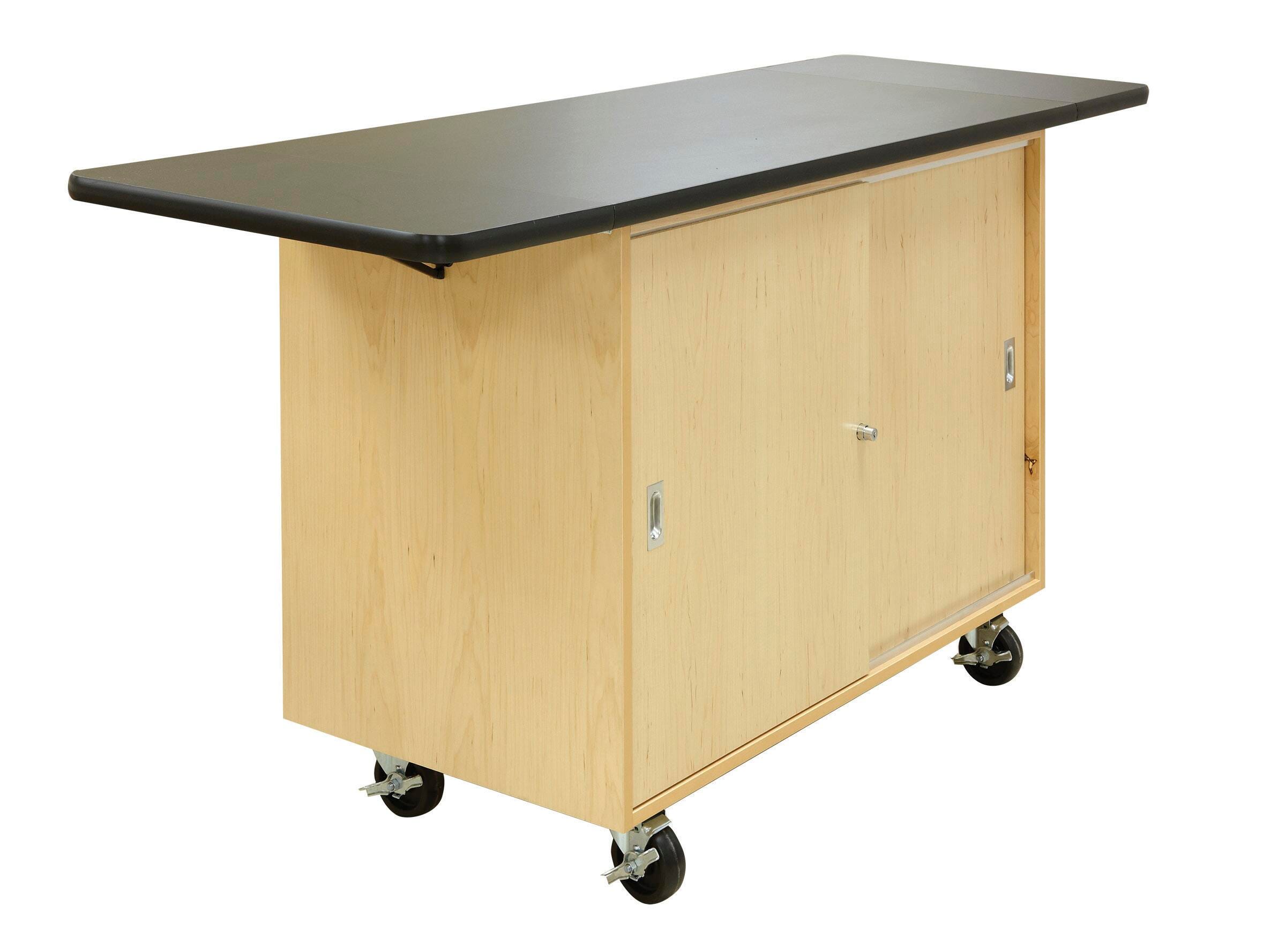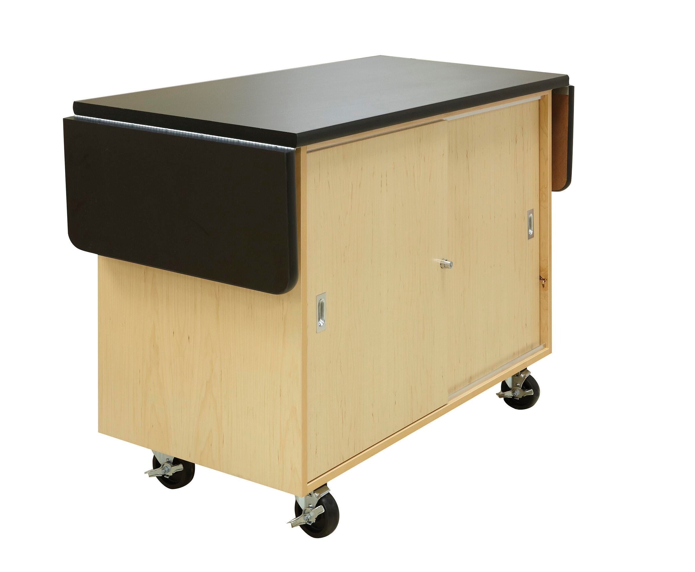 Diversified Woodcrafts Shain Shop-Built Black Classic Mobile demonstration Table with Drop Leaves has plastic laminated top to render tremendous durability. Table measures 48 x 24 x 36 inches, when the drop leaves are down. It measures 72 x 24 x 36 inches when the drop leaves are up.