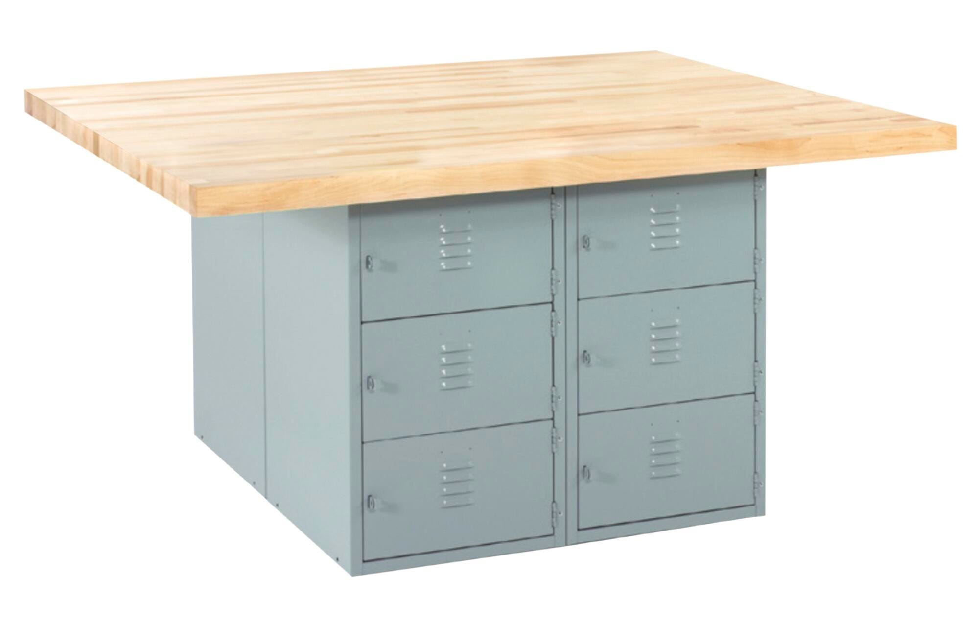 Twelve locker work bench has a sturdy all steel constructed base with reinforced side panels and a 2-1/4 inch thick maple top.