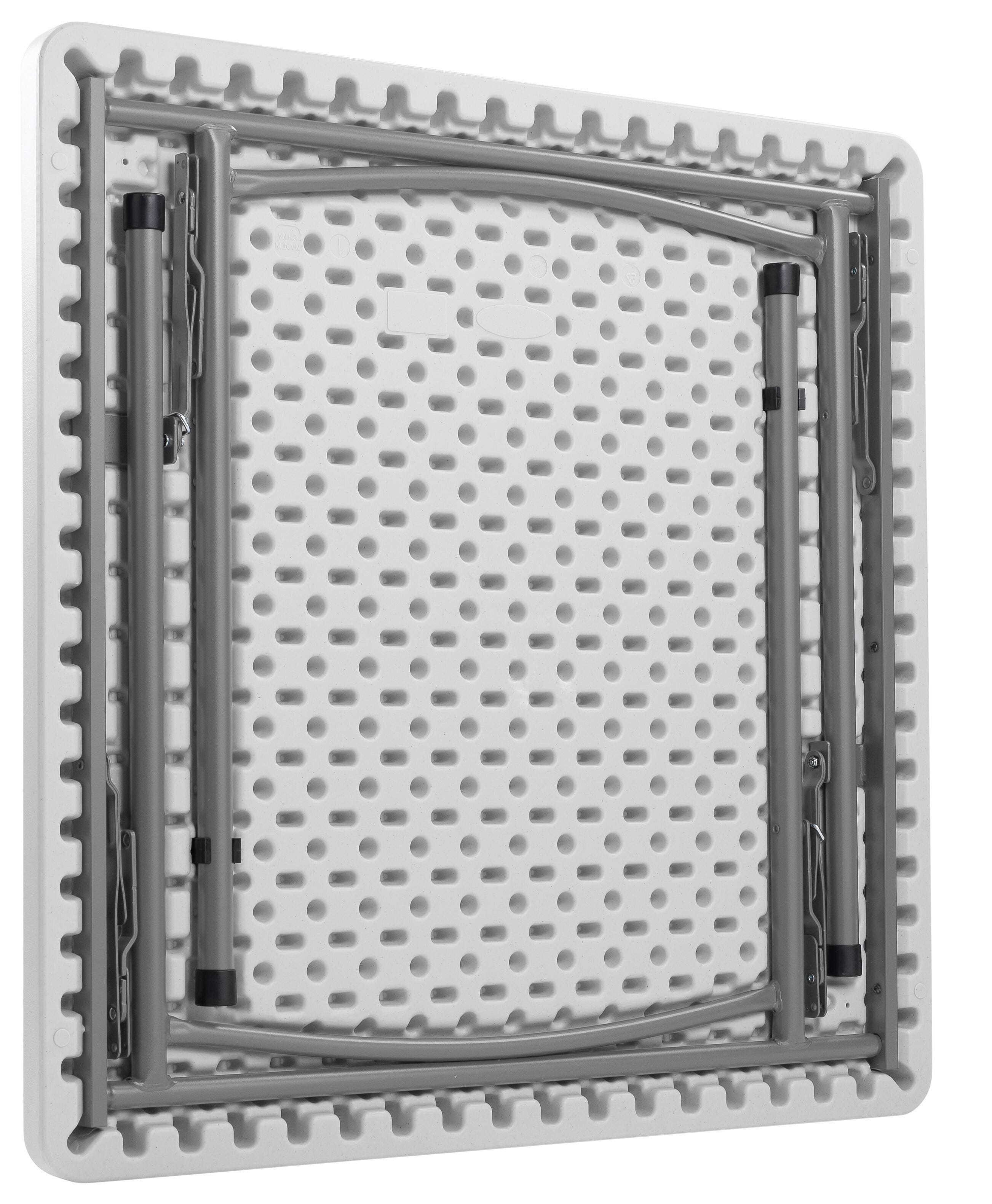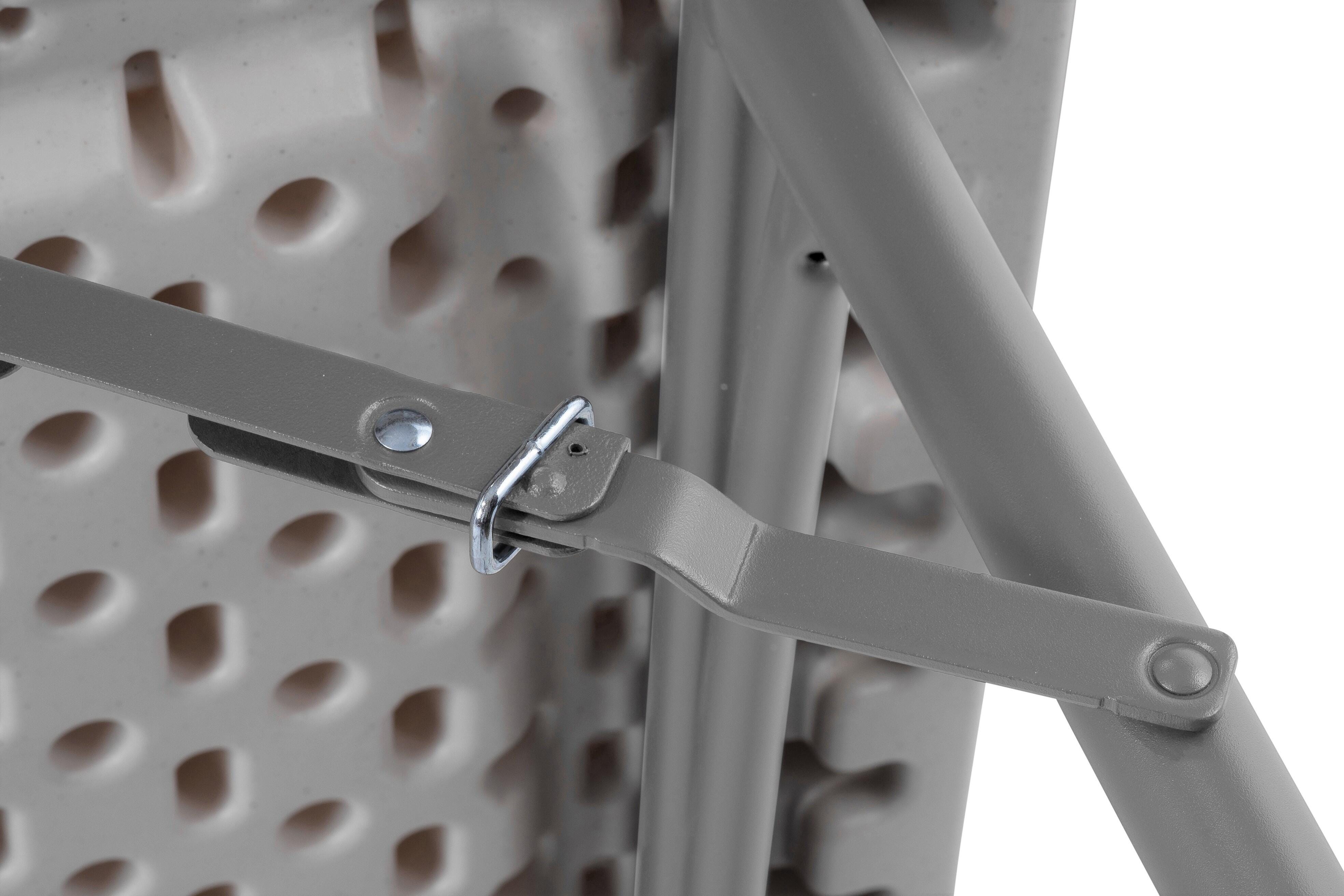 The weatherproof table features a lightly sprinkled gray texture with matching powder-coated legs that are resistant to corrosion yet still enable a smooth surface for writing. The plastic tabletop is heat-resistant up to 212 degrees Fahrenheit and designed with a non-bowing eggshell structure for fortification to hold up to 500 pounds of distributed weight. The legs are straight style and feature gravity slide locks which maintain the table's overall strength and support.