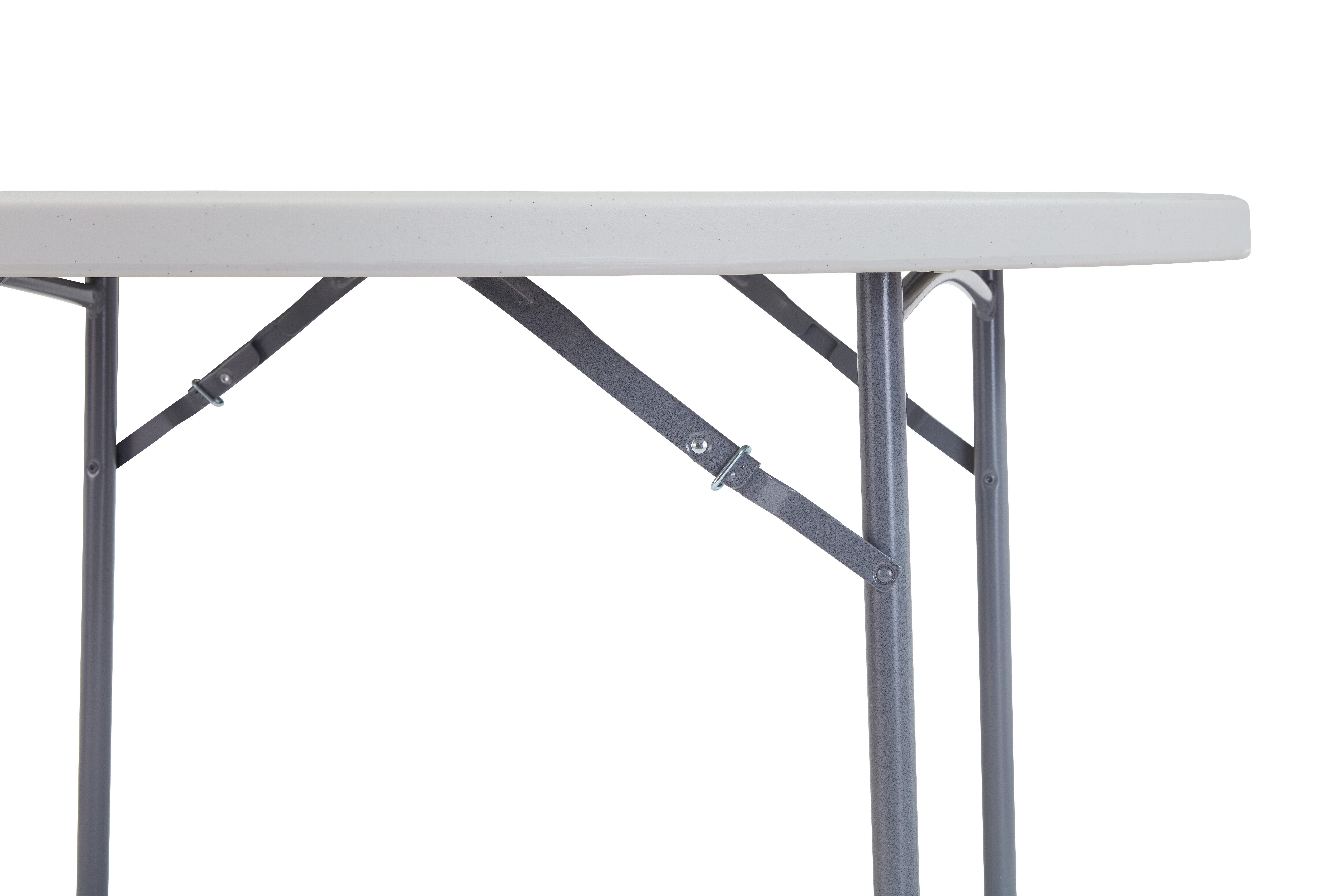 Blow-molded plastic top, powder-coated frame, long-lasting durability. This round folding table is perfect for banquet halls, conferences, event spaces, or anywhere that needs a versatile indoor or outdoor table option. Attractive table features a lightly sprinkled gray with matching powder-coated legs that are resistant to corrosion. The easy-to-move table is appropriately designed to offer extreme comfort and is suitable for any occasion. Table measures 48 diameter x 29-1/2 H inches.