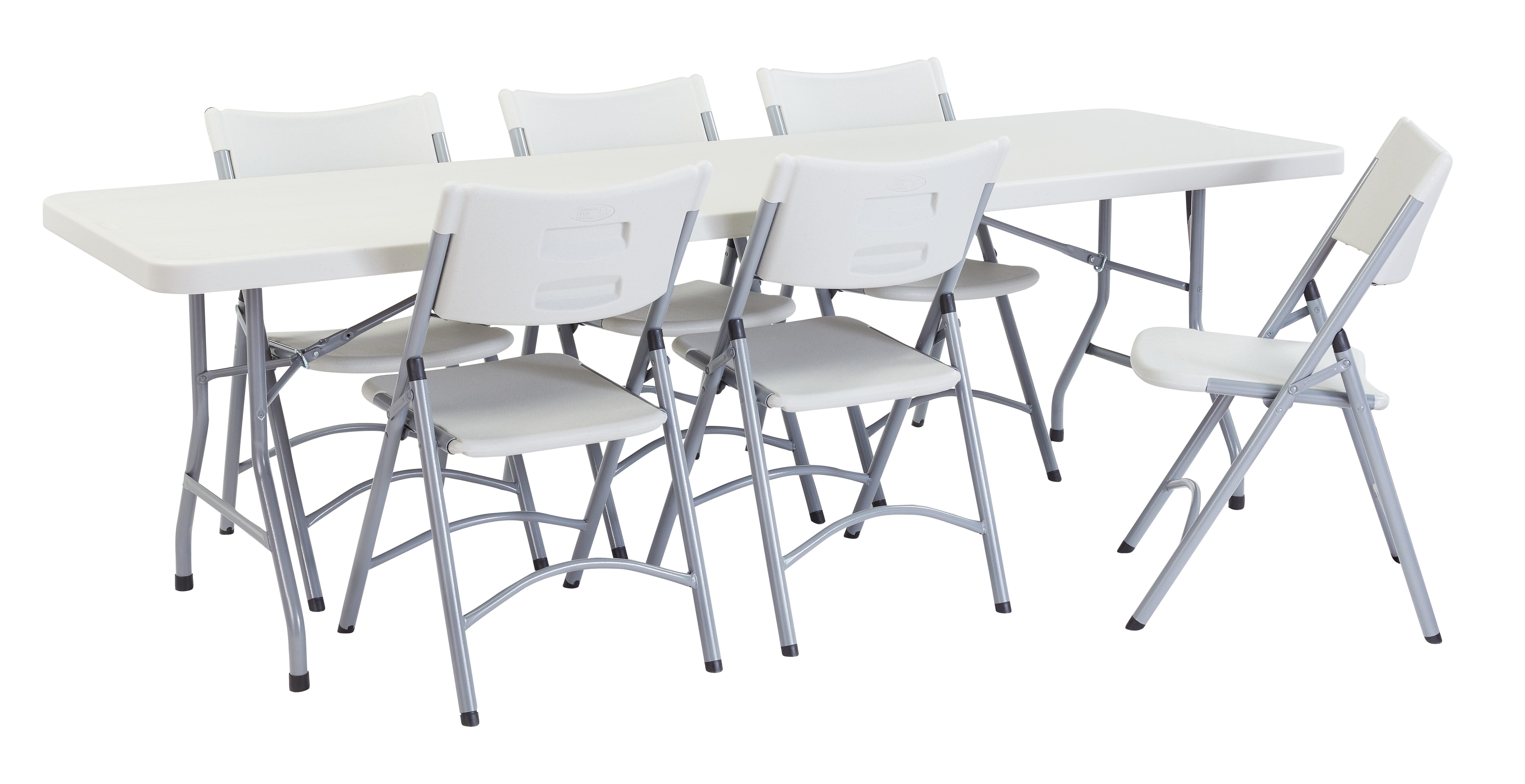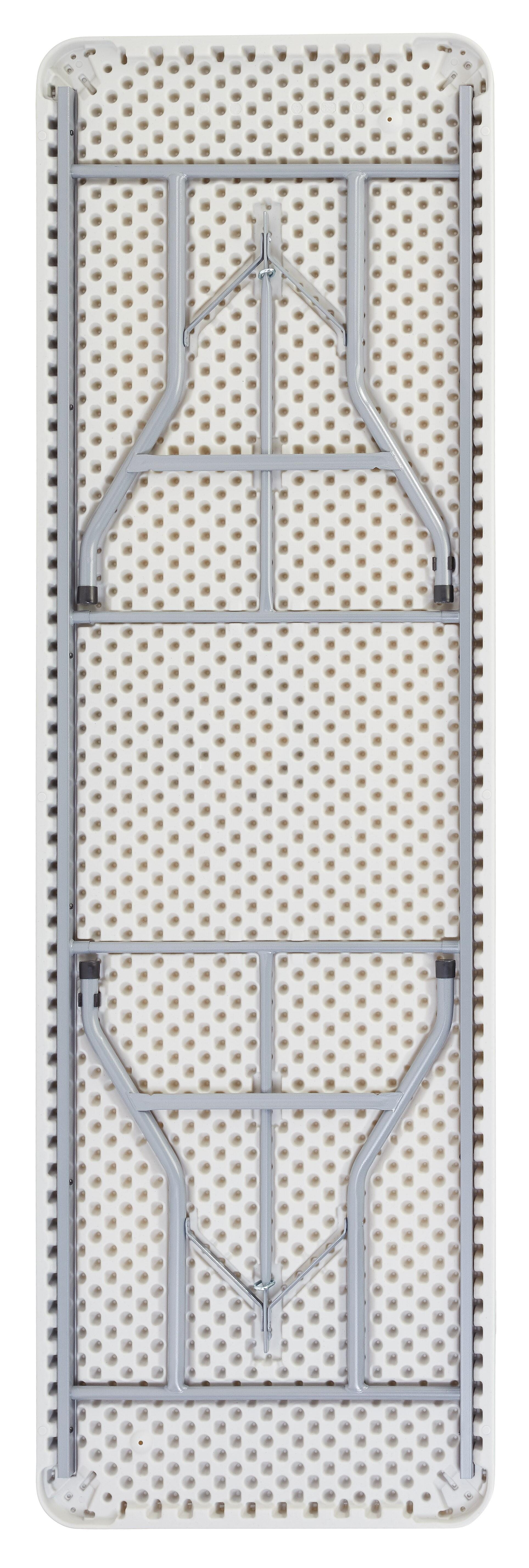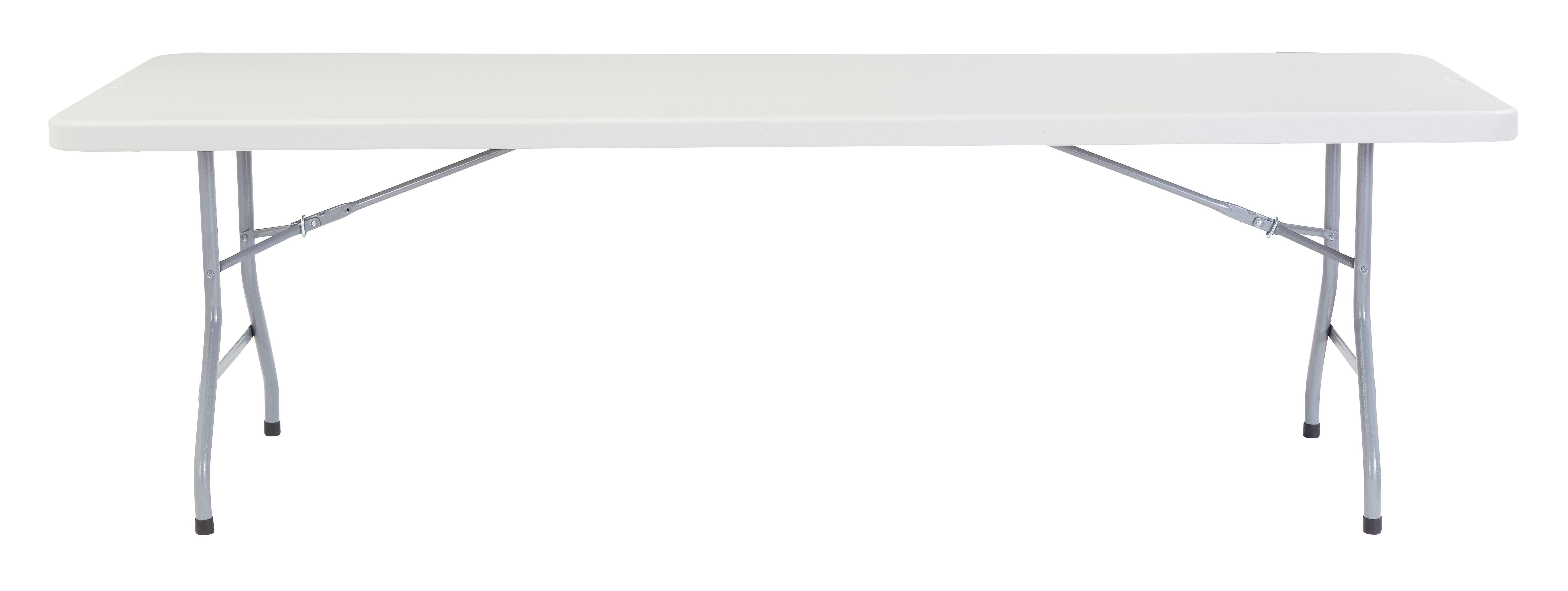 This rectangular folding table is durable and lightweight, weather-resistant for indoor and outdoor use and perfect as a writing surface for pop-up classrooms. Features a lightly sprinkled gray with matching powder-coated legs that are resistant to corrosion. The easy-to-move table is designed to offer extreme comfort and is suitable for any occasion. Measures 96 W x 30 D x 29-1/2 H inches with 1-3/4 inch thick blow-molded plastic top.