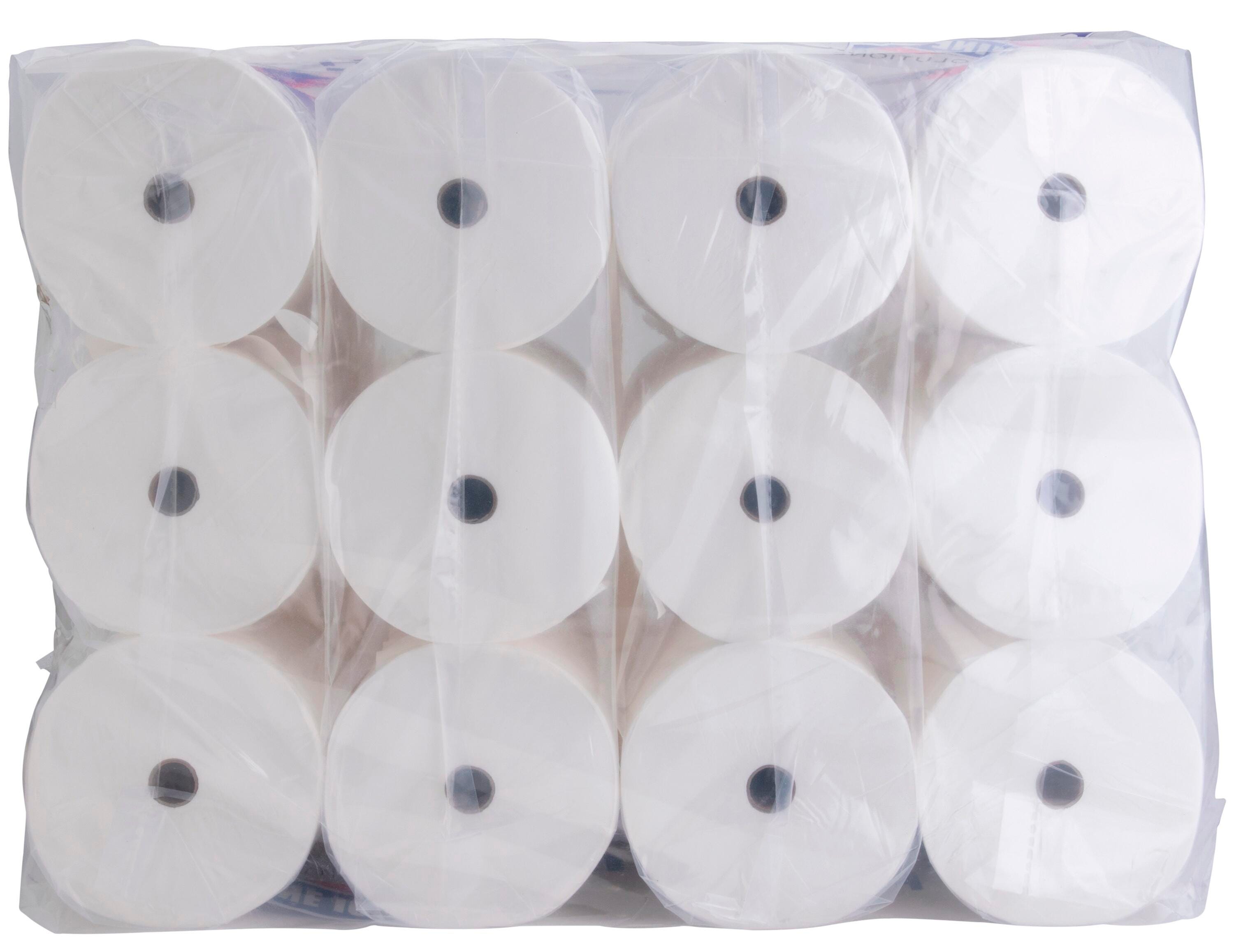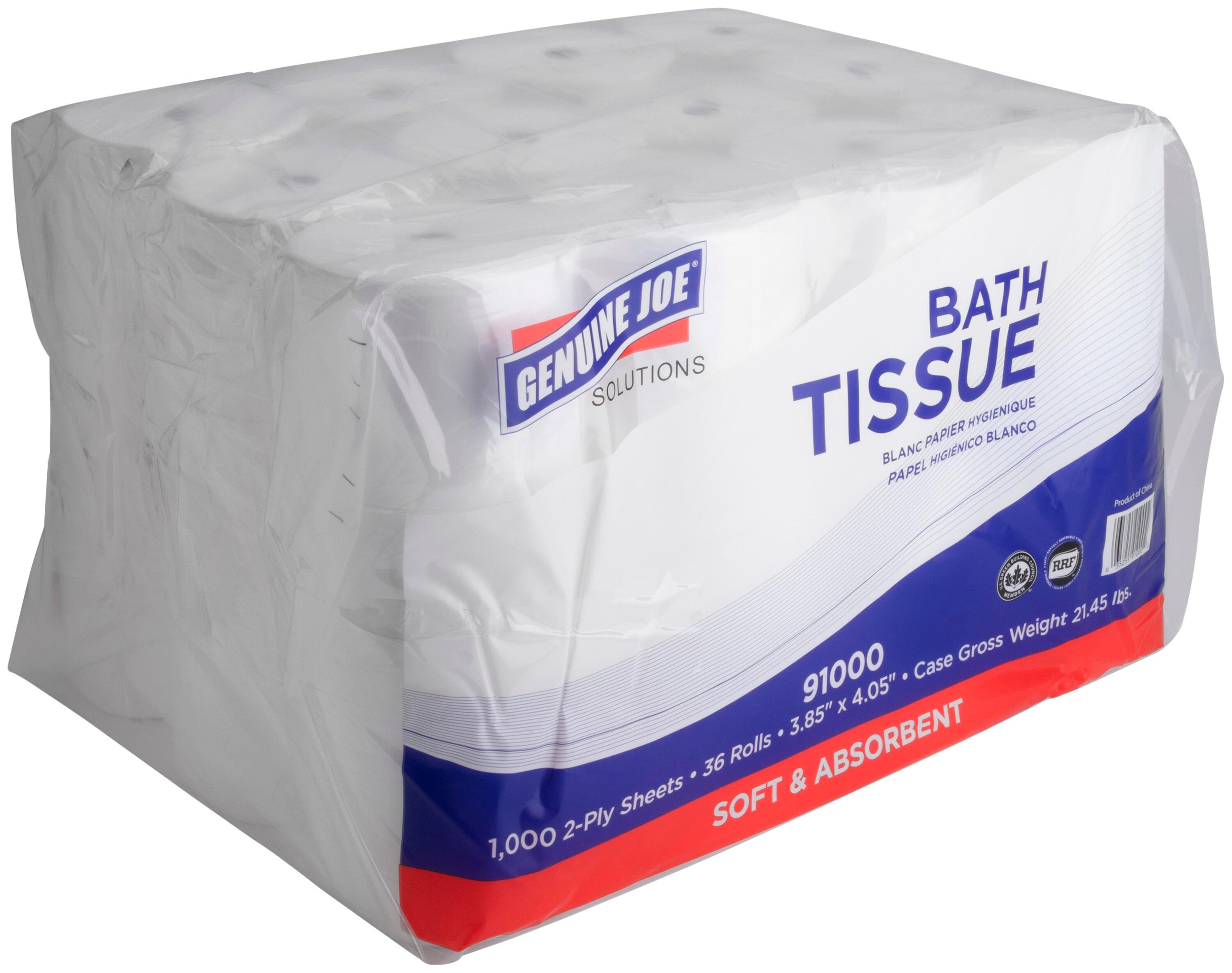 Bath tissue is ideal for replacing standard tissue rolls. With 100 percent more tissue on a roll than standard rolls, this bath tissue doubles the capacity and reduces roll replacements. It is made from sustainable, virgin Rapidly Renewable Fiber (RRF) to produce a whiter, brighter, softer and greener product. This two-ply, embossed bath tissue provides an improved sensory hand feel that gives the ultimate at-home look and feel. Use these low-core rolls in Genuine Joe Solutions Bathroom Tissue Dispensers and with standard bathroom tissue roll dispensers with adapter. White.