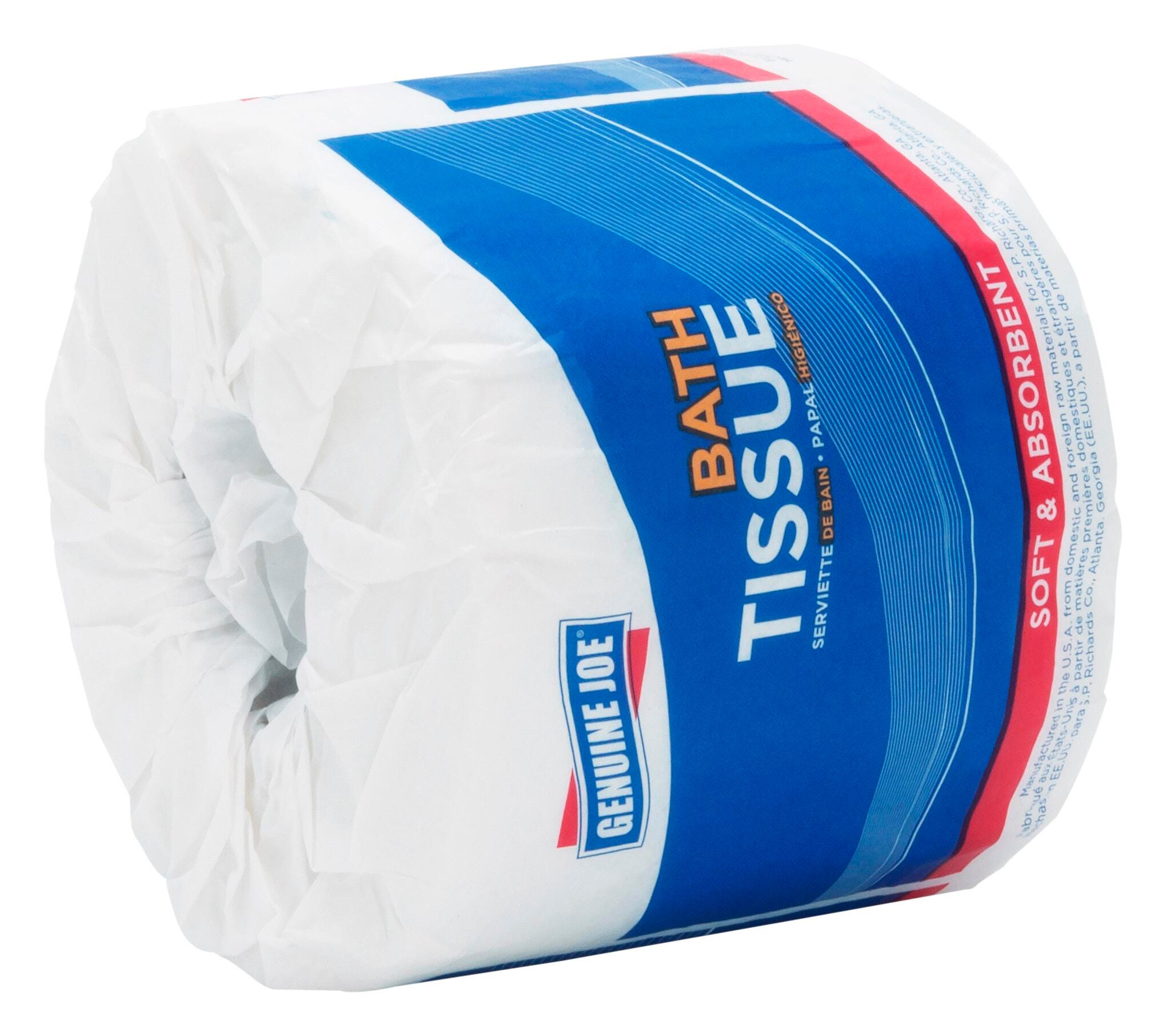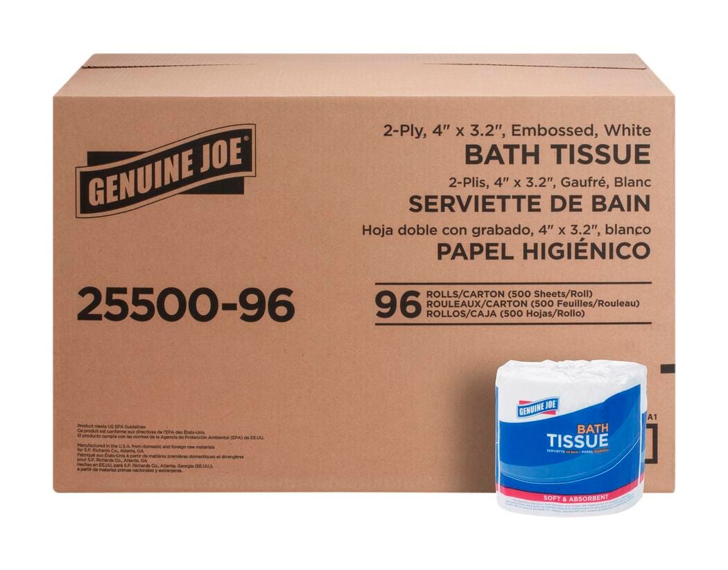 Genuine Joe 2-ply Standard Bath tissue roll offers exceptional whiteness, absorbency and softness in restroom applications. High percentage recycled fiber with post-consumer material construction fits standard-roll and bathroom-tissue dispensers. 500 sheets per roll. Sold as 96 rolls per Carton. 4 in x 3.15 in. Meets EPA guidelines. White.