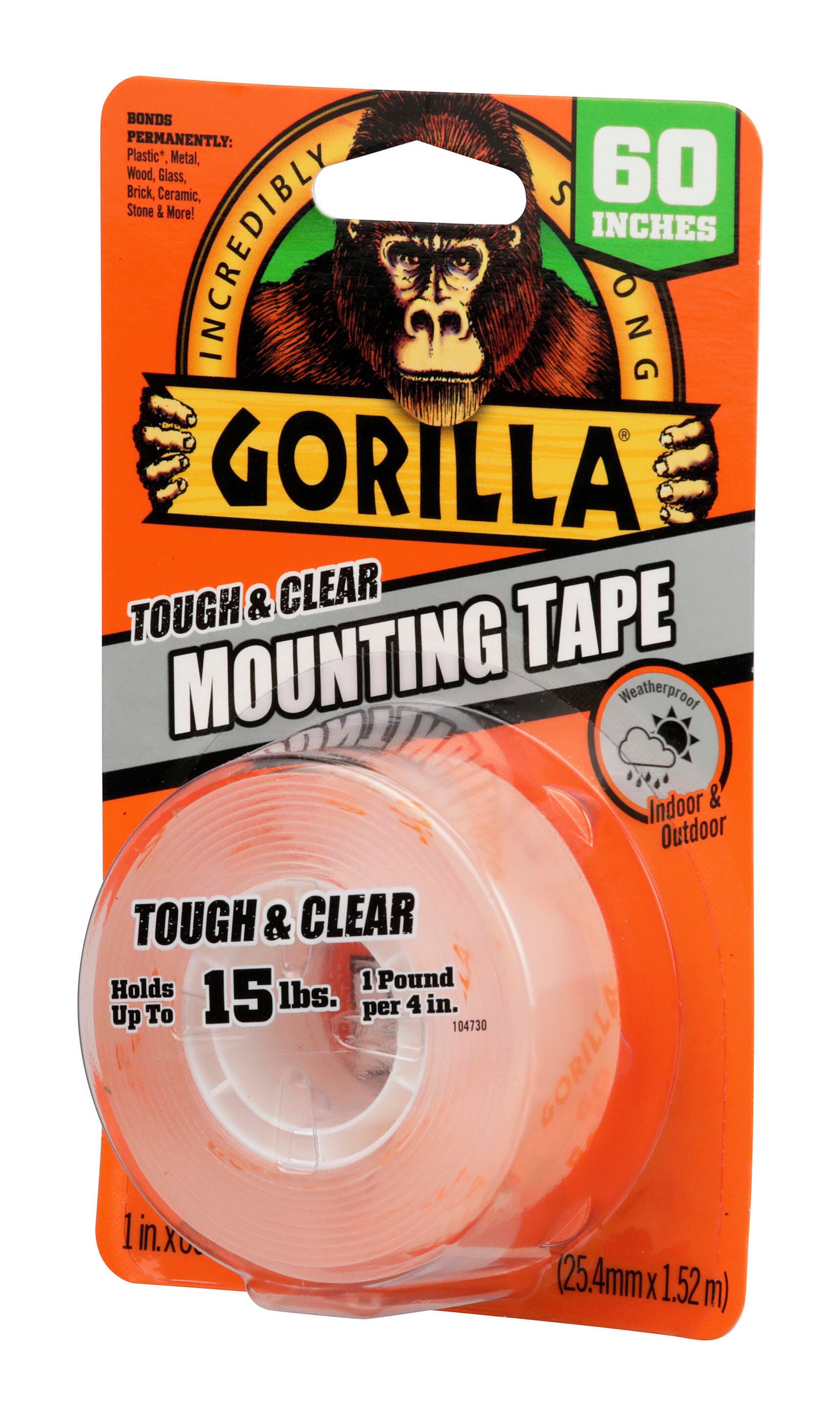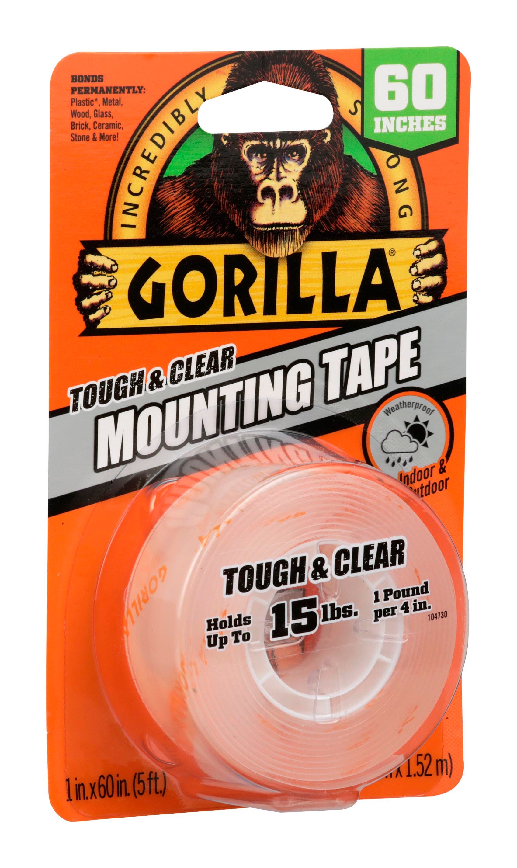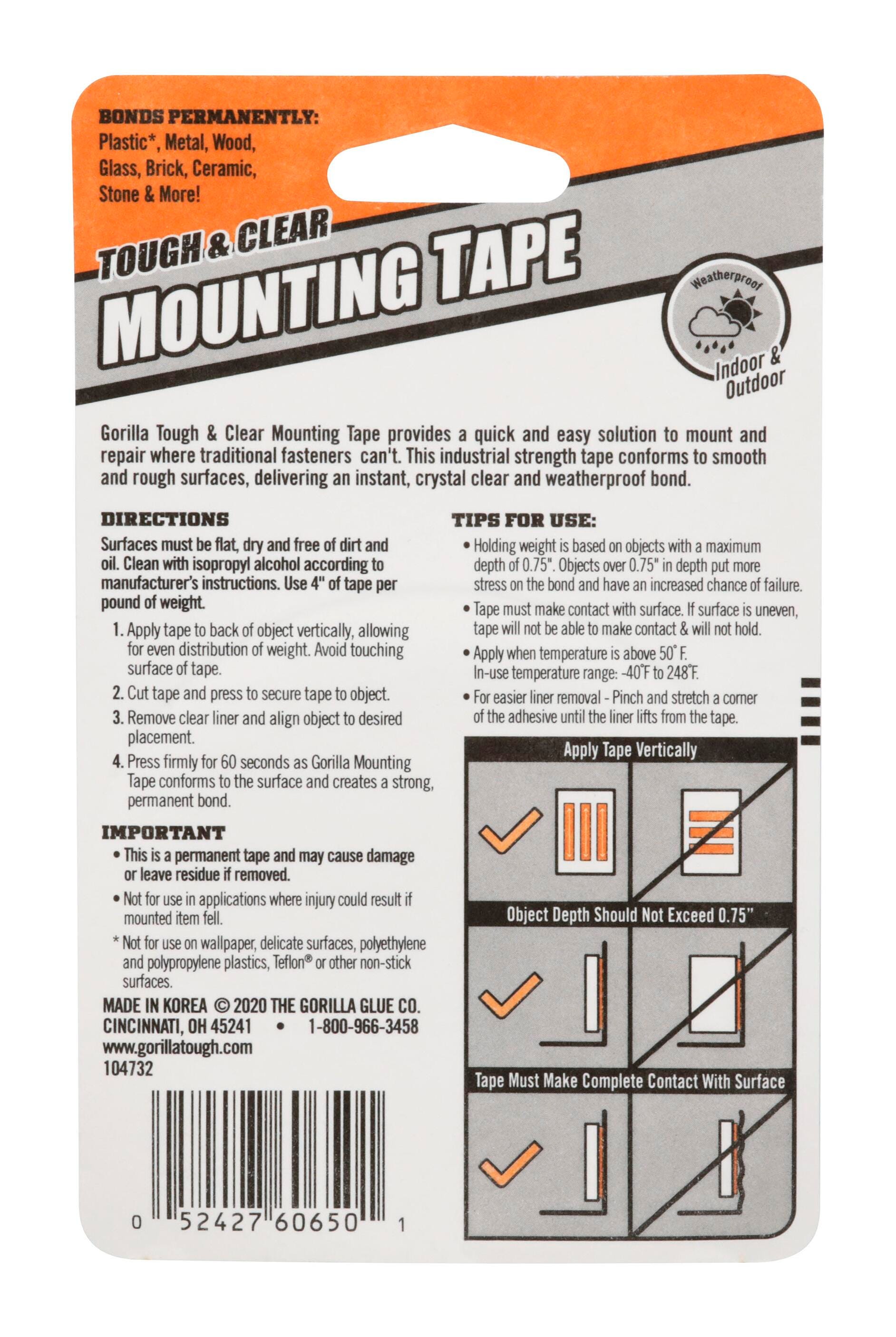 Gorilla Tough & Clear Mounting Tape provides a quick and easy solution to mount and repair. This industrial strength tape conforms to smooth and rough surfaces, delivering an instant, crystal clear and weathproof bond.