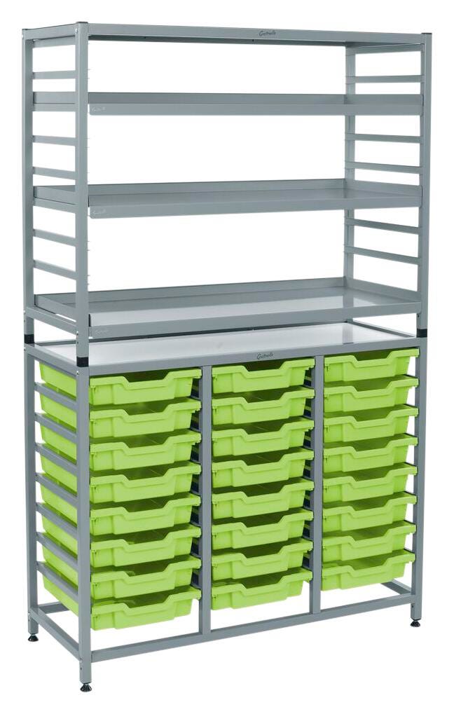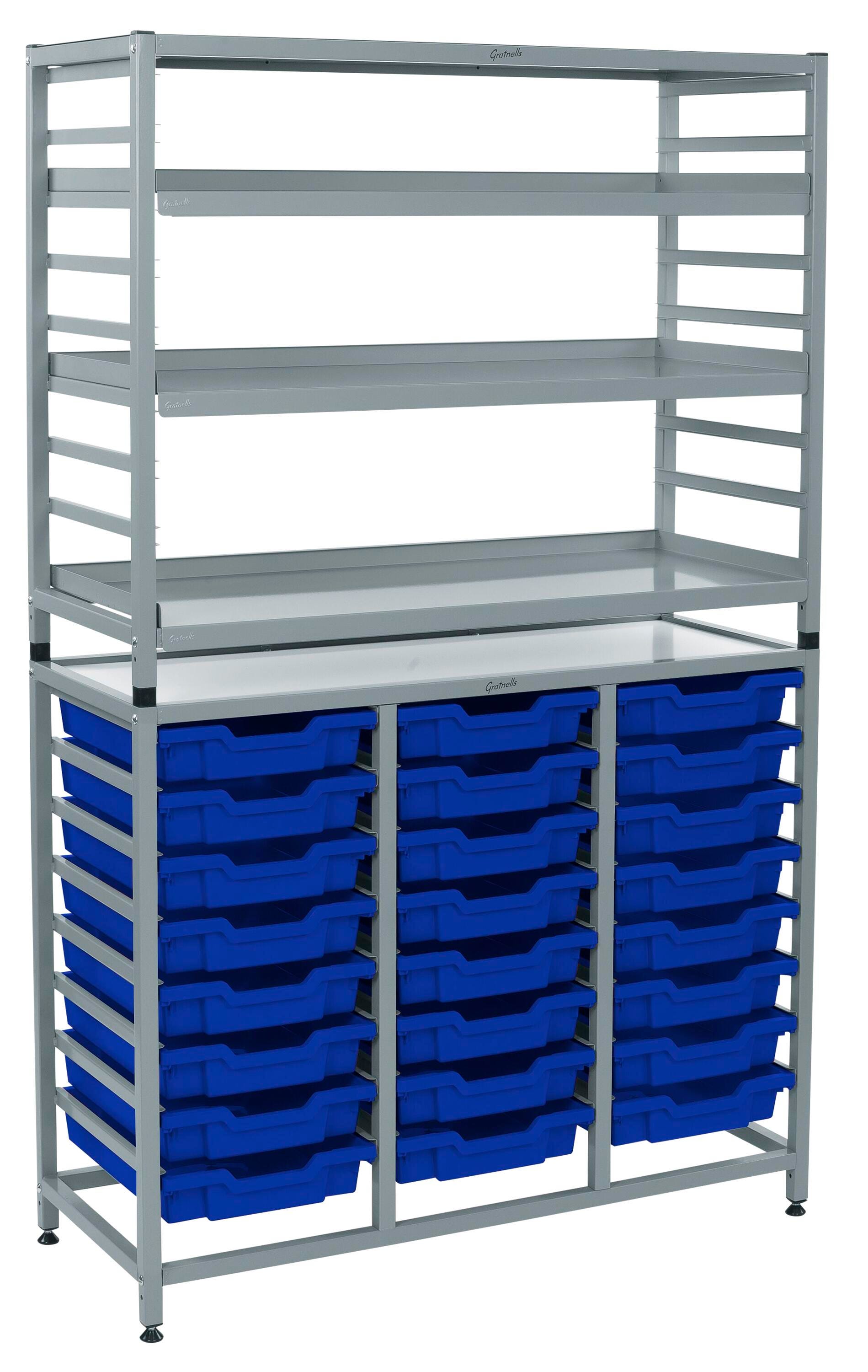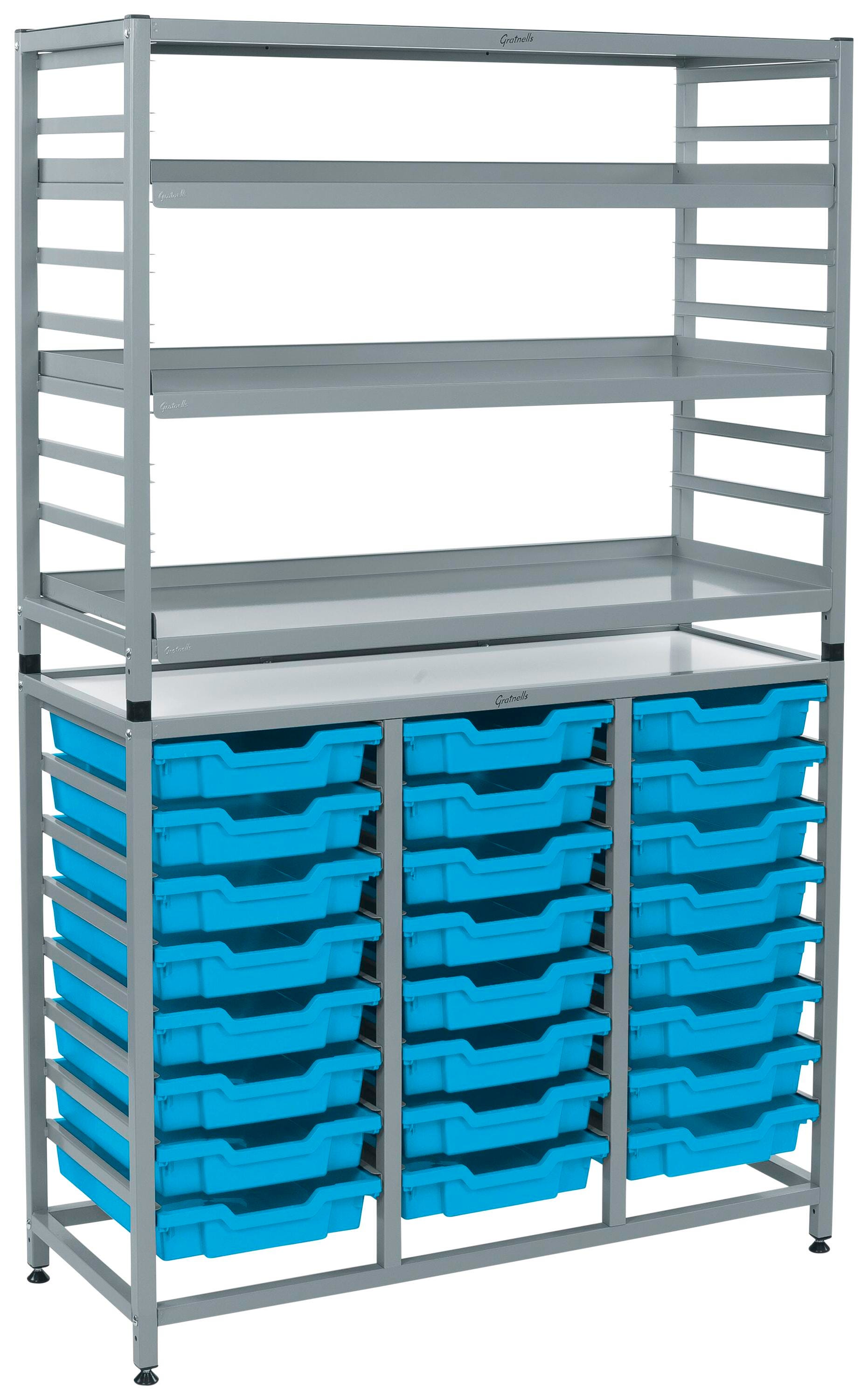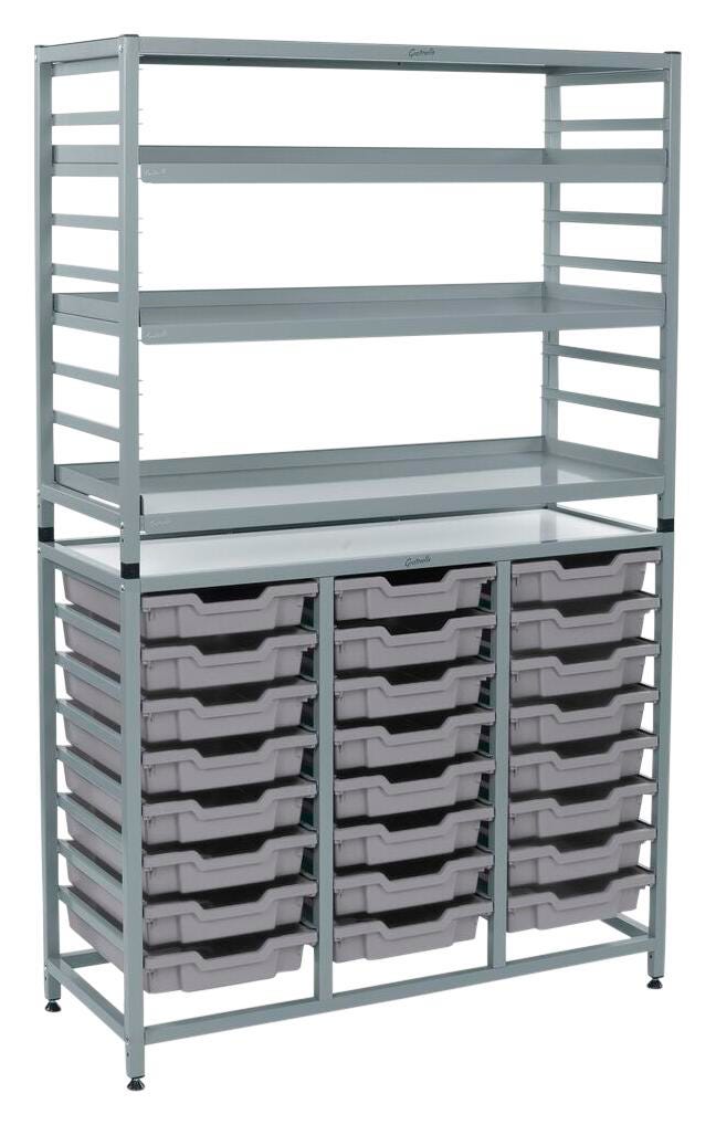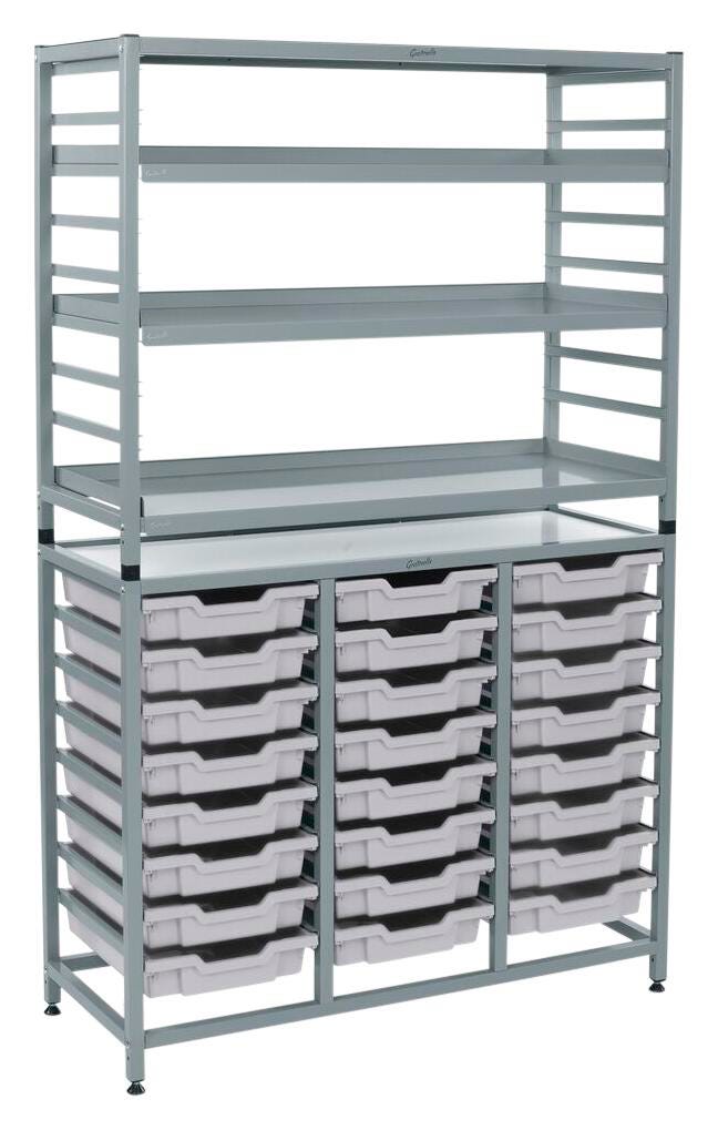 Gratnells Dynamis Cart Combo Set, 24 Shallow F1 Trays and 3 Shelves, 41-1/2 x 16-3/5 x 67-1/5 Inches