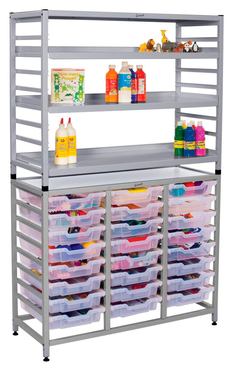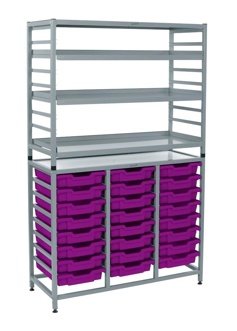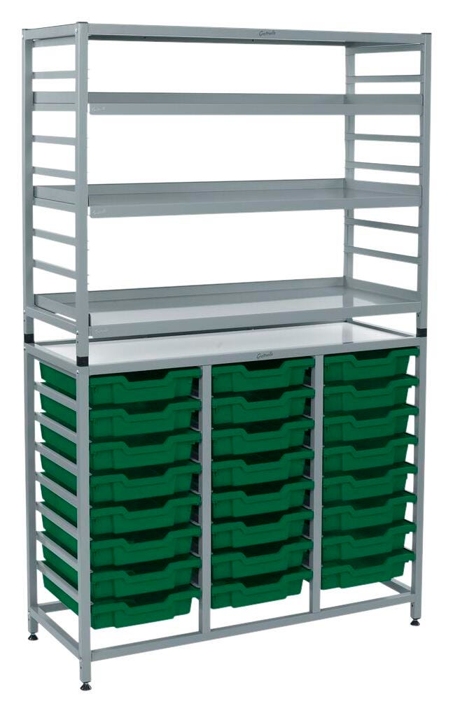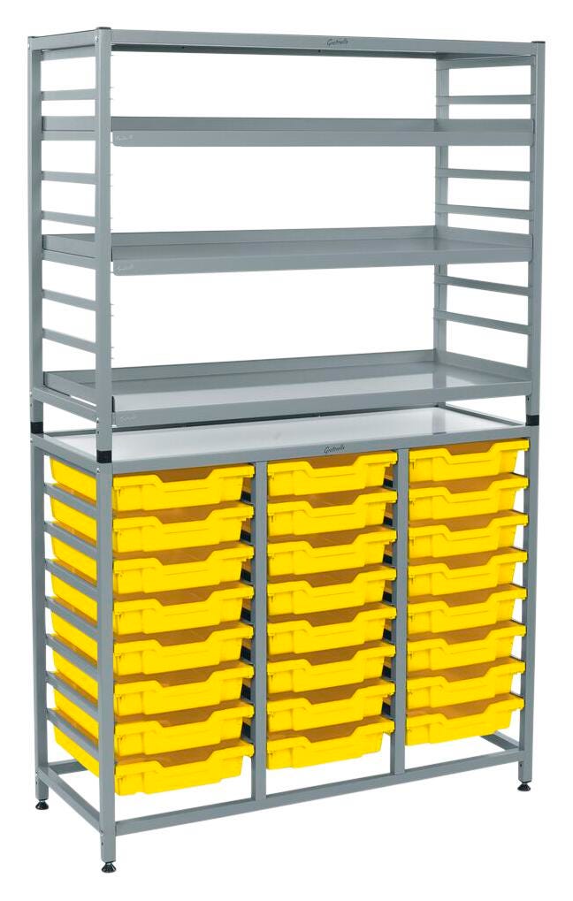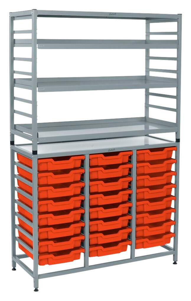Gratnells Dynamis Cart Combo Set, 24 Shallow F1 Trays and 3 Shelves, 41-1/2 x 16-3/5 x 67-1/5 Inches