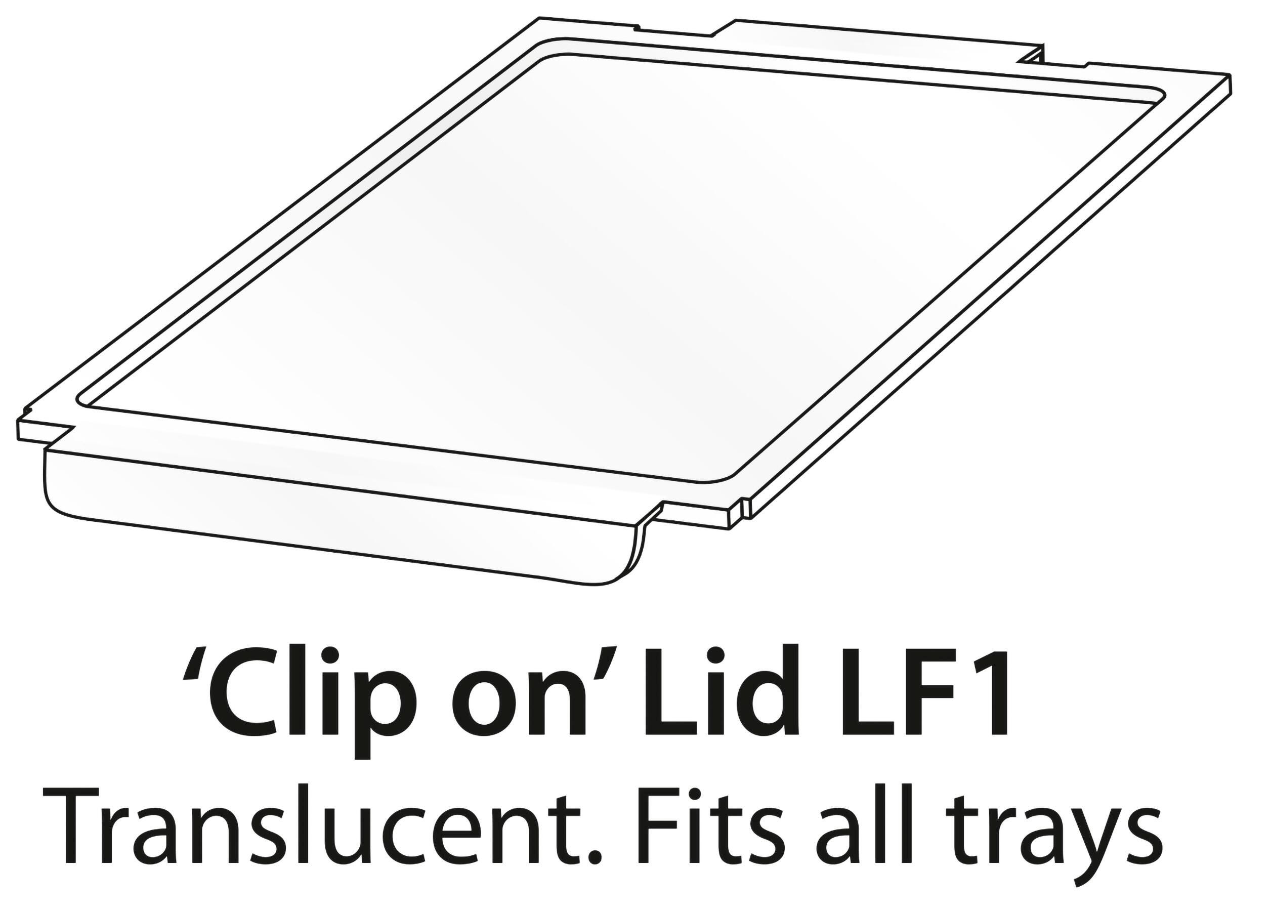 Gratnells Clip on lids measuring 11-1/5 x 17 x 1-1/3 are designed for all Gratnells standard F trays (Shallow, deep, extra deep and jumbo - F1, F2, F25 and F3), the lids are translucent to easily see contents.