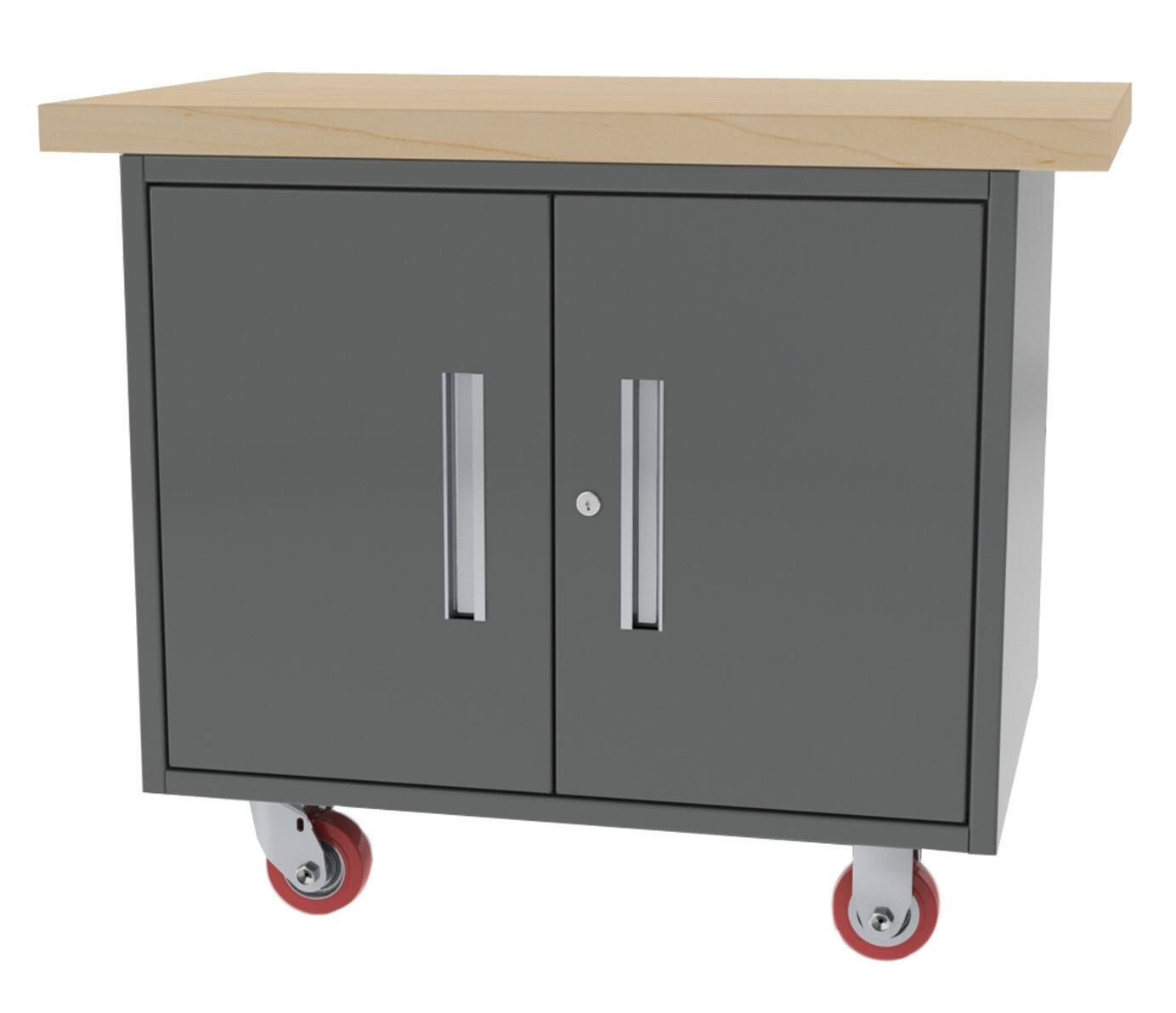 Greene Mobile Workbench measuring 38 x 24 x 34 inches features a maple top and includes 5-inch locking casters for easy movement. It has 2 locking doors, 2 adjustable shelves, and recessed handles with aluminum construction. Storage workbench features a keyed cylinder lock with all welded steel construction for safety.