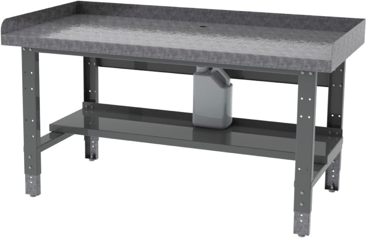 - Workbench also has a galvanized steel work surface with a drain and 2-inch height back as well as stops on the work surface