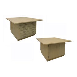 This Art and Printmaking Workstation serves as a great project center providing both a large, sturdy work surface as well as a variety of storage options. The base consists of two cabinets placed back-to-back. The cabinets are built using heavy-duty solid hard maple face frame construction. One side of this workstation features a 6-drawer cabinet for paper and tool storage. The maple grain patterned HPL top measures 64 W x 54 D x 1-1/4 H inches and overhangs the base by roughly 9 inches on all sides allowing for seating around the entire perimeter of the workstation. Each drawer measures 31 W x 23 D x 1-3/4 H inches (I.D.). The opposite side of the unit is a double-door cabinet with an adjustable shelf for flexible storage of larger project items. The overall height is 32-1/4 inches.Features