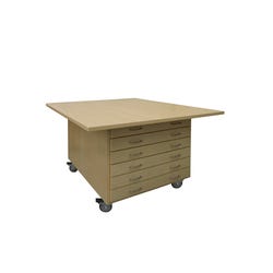 Find the perfect project center in this Art and Printmaking Workstation. This workstation serve as great project centers providing both a large, sturdy worksurface as well as a variety of storage options. The base consists of a single, double-sided cabinet, built using heavy-duty solid hard maple face frame construction. One side of this workstation features a 6-drawer cabinet for paper and tool storage. The maple grain patterned HPL top measures 64 x 54 x 1-1/4 inches and overhangs the base by roughly 9 inches on all sides allowing for seating around the entire perimeter of the workstation. Each drawer measures 31 W x 23 D x 1-3/4 H inches (I.D.). The opposite side of the unit is a double-door cabinet with an adjustable shelf for flexible storage of larger project items. Overall height is 33-1/4 inches with casters.Features