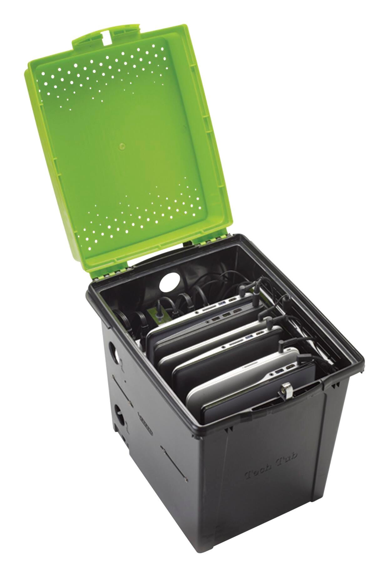 Copernicus Tech Tub Premium is secure, mobile, and lightweight, and makes device sharing and charging easy. Charges up to 6 iPads or other tablets, with or without cases. Improved design features adjustable dividers, cable management pocket to keep cables organized, out of sight, and in line with each device, and cable management for power strip cord (on back). Includes locking block and pin to lock tub to table, two padlocks with the same keys, plus a 6 outlet USB hub so you can sync and charge in ONE unit, no need to switch to separate sync hub. The USB hub can mount internally or externally as needed to support up to 6 devices in one tub (depending on the size of your device and case). Tech Tub measures 12-1/2 x 16 x 16 inches. Lifetime Tech Tub & Lid Warranty; 1 Year Tech Tub Power Supply Warranty. Please note, this Tech Tub is not compatible with 8th Generation iPads.Please note, when USB hub is mounted to the outside of the Original Tech Tub, it will not fit in the Original Tech Tub Trolleys.