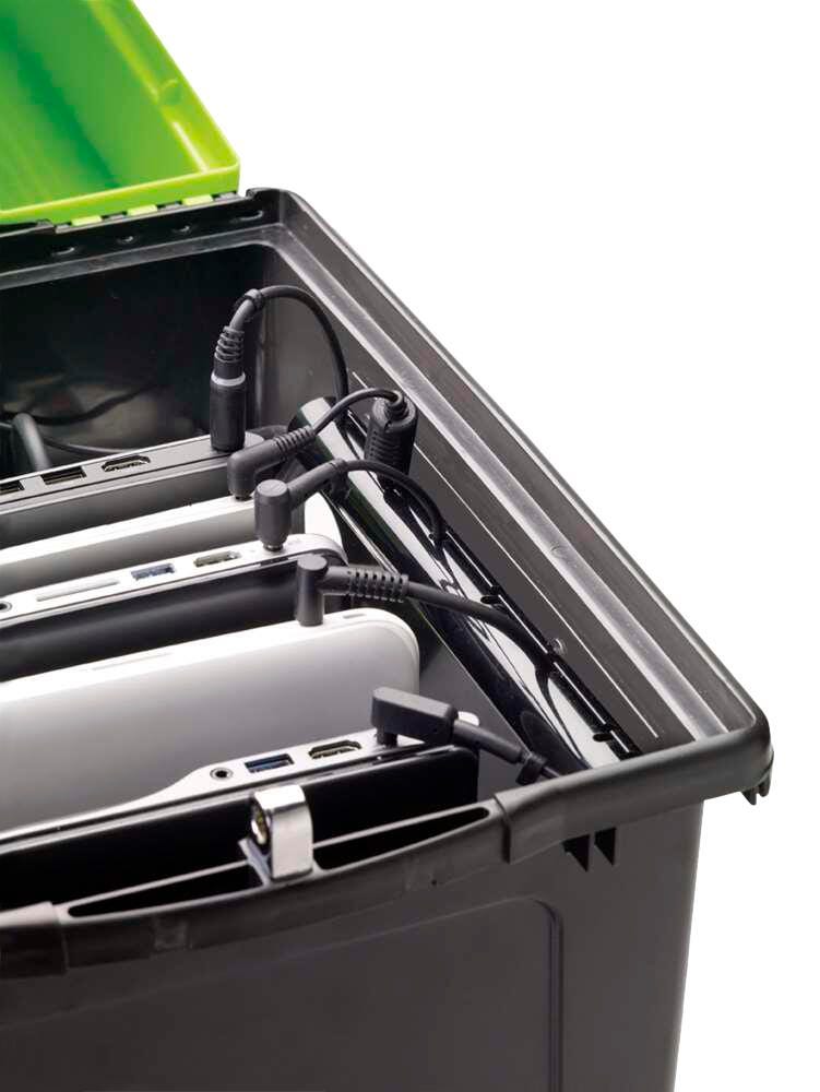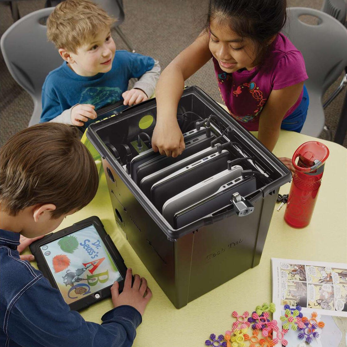 This new mid-range, top-loading Tech Tub has all the features of the premium models, including a padlock for securing the devices inside. The only difference is there is no locking block and pin to secure the tub to surfaces. Tech Tub Standard has the capability to charge up to 6 Chromebooks, iPads, or other tablets. It makes sharing small sets of devices easy within a classroom or throughout a school. Adjustable dividers can accommodate most cases and the side cable channel helps keep cords neat, tidy, and lined up with each device. Made from highly durable heat-resistant ABS plastic and is vented to ensure airflow. Please note, this Tech Tub is not compatible with 8th Generation iPads. For an iPad 8 charging solution, please purchase item# 2087826.Features