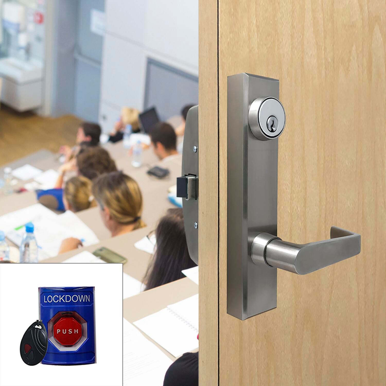 Raise Plexi Safety Shield and push for LOCKDOWN then Push to Deactivate. LED SIGNALS indicate normal: White, LOCKDOWN: Red, Classroom Mode: Green