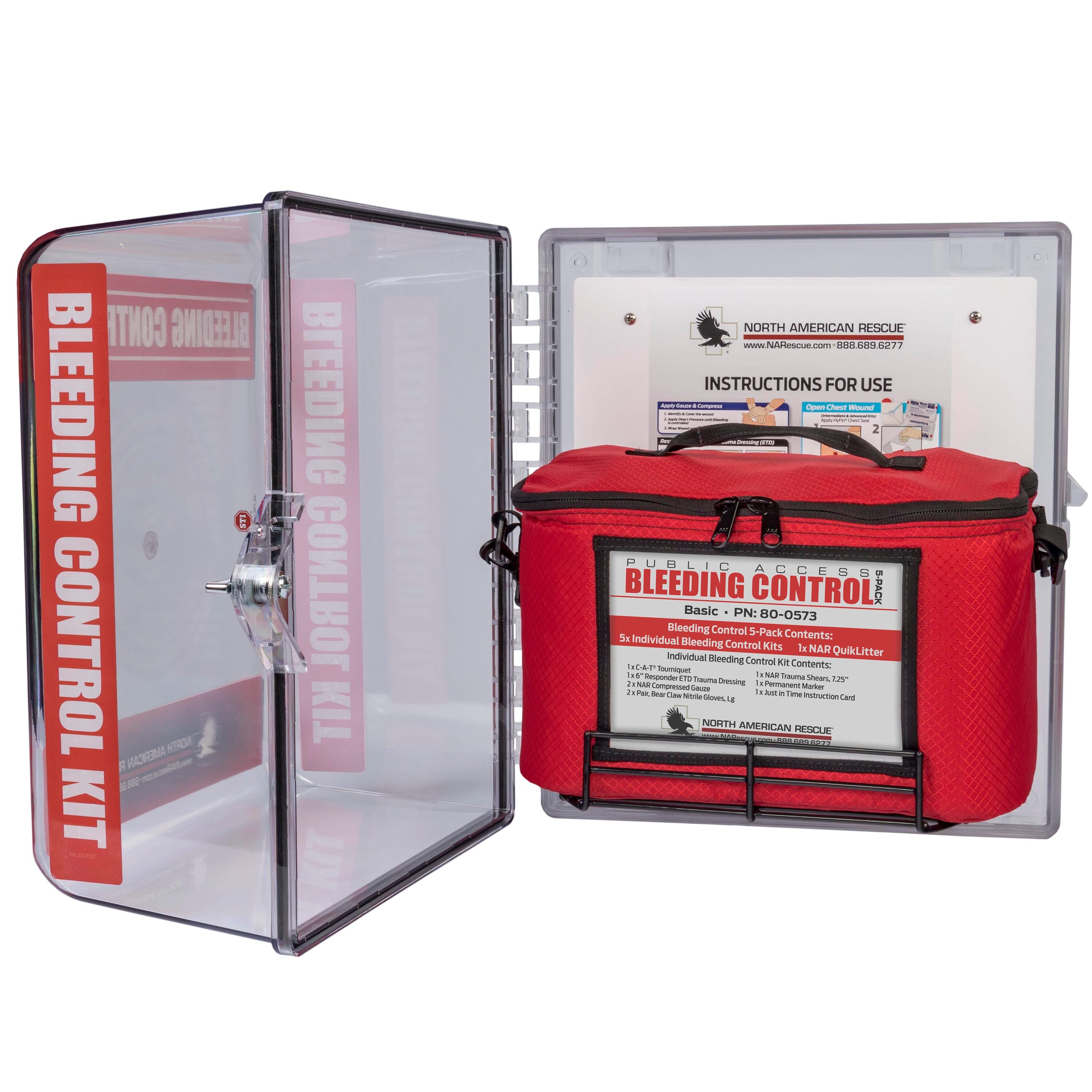 These Wall Stations include 5 individual Bleeding Control Kits packaged in vacuum sealed pouches stored within an easy to open nylon carrier and includes 1 NAR QuikLitter for moving injured casualties.