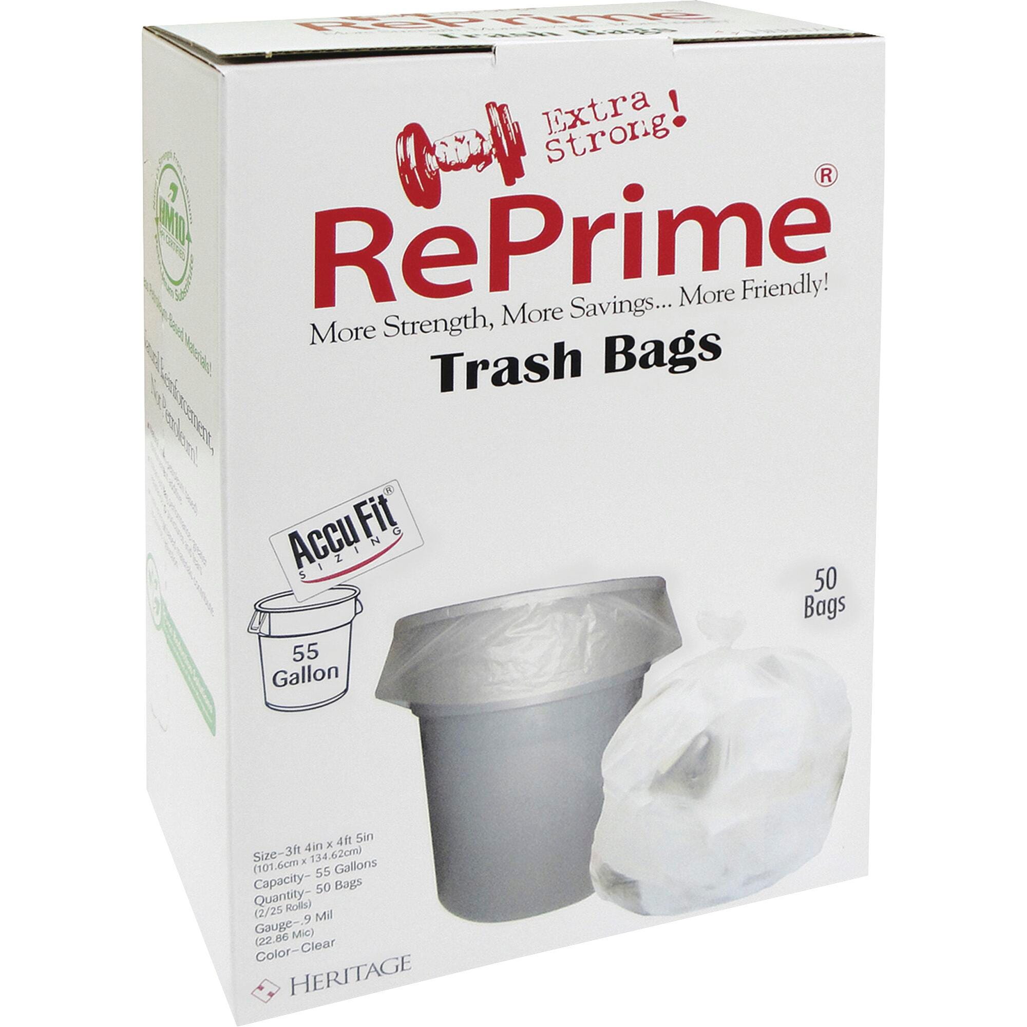 These Heritage trash bags feature Accufit sizing so they fit perfectly into common cans with no excess plastic and no falling completely into the container. Each can liner holds up to 55 lb. or 55 gallons. Premium-quality prime resin resists tears and punctures. Can liners include a natural, (nonpetroleum-based) reinforcement additive so less plastic goes into landfills.