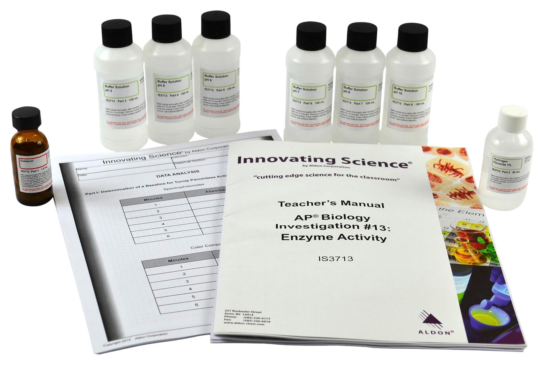 Students will then use an extract of turnips to examine the reaction between hydrogen peroxide and the enzyme peroxidase while testing one or more factors that influence the rate of enzyme reactions.In this lab students will develop data collection strategies and analyze their results. This kit contains enough materials for 8 groups. Teachers manual and Student Study Guide copymasters are included. Meets AP Science Practices 4, 5, 6, and 7, and Big Idea 4.