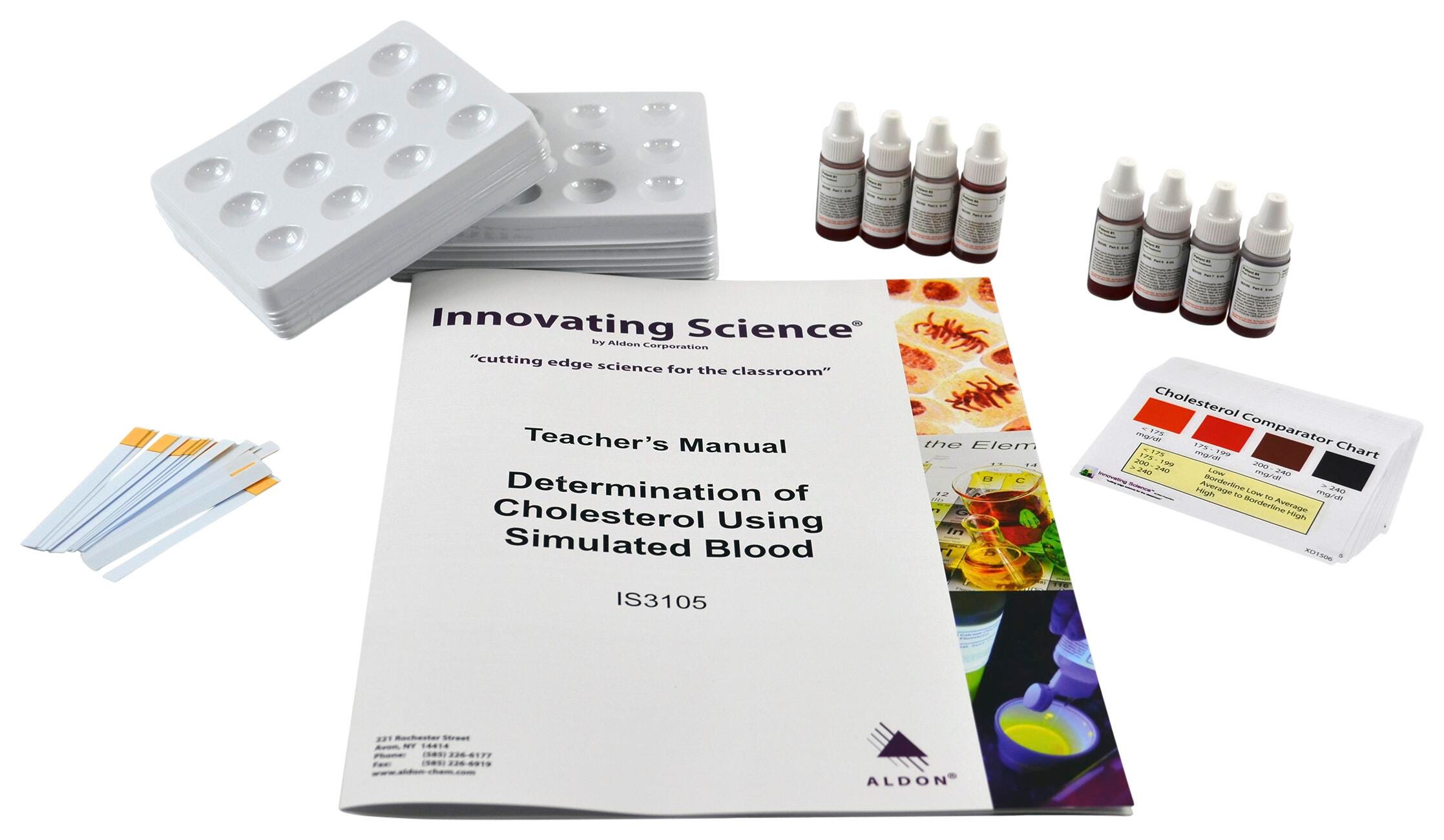 Explore the levels of cholesterol and determine the best treatment plan with Aldon’s Determination of Cholesterol Using Simulated Blood kit. In this activity, students will be doctors in determining four patients’ cholesterol levels using test strips and simulated blood. After testing and analyzing results, students will recommend treatment plans based on lifestyles of each patient to lower their level of cholesterol. Included are a Teacher’s Manual and a Student Study Guide.- 8 Simulated Blood Samples