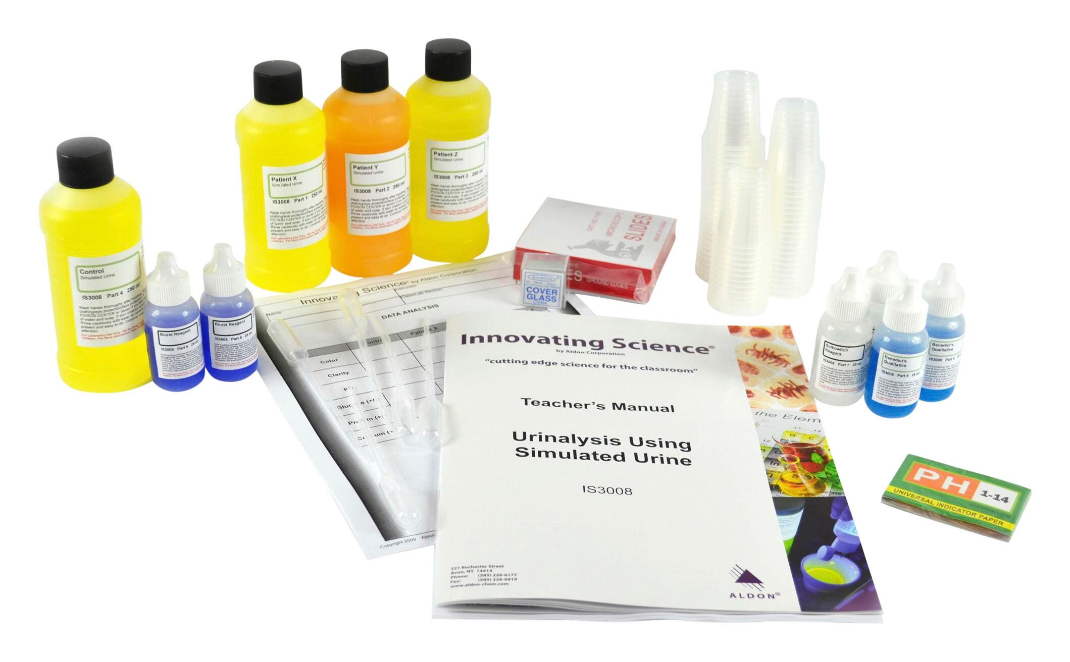 Urinalysis, one of the oldest medical diagnostic tests performed, is to this day still one of the most common. In this activity, students will use simulated urine to avoid the unpleasantness of using the real thing while still performing actual tests used on real urine samples. Students will examine the simulated urine for factors such as pH, color, clarity, as well as test for the presence or absence of proteins, glucose, and calcium. The students will then examine the samples microscopically to determine if crystals may be present in any of the samples. Kit contains enough materials for 15 groups of students. Teacher's Manual and Student Study Guide copymasters are included. Needed but not supplied are a hot water bath, glass test tubes, and compound microscopes (4X/10X/40X).Features