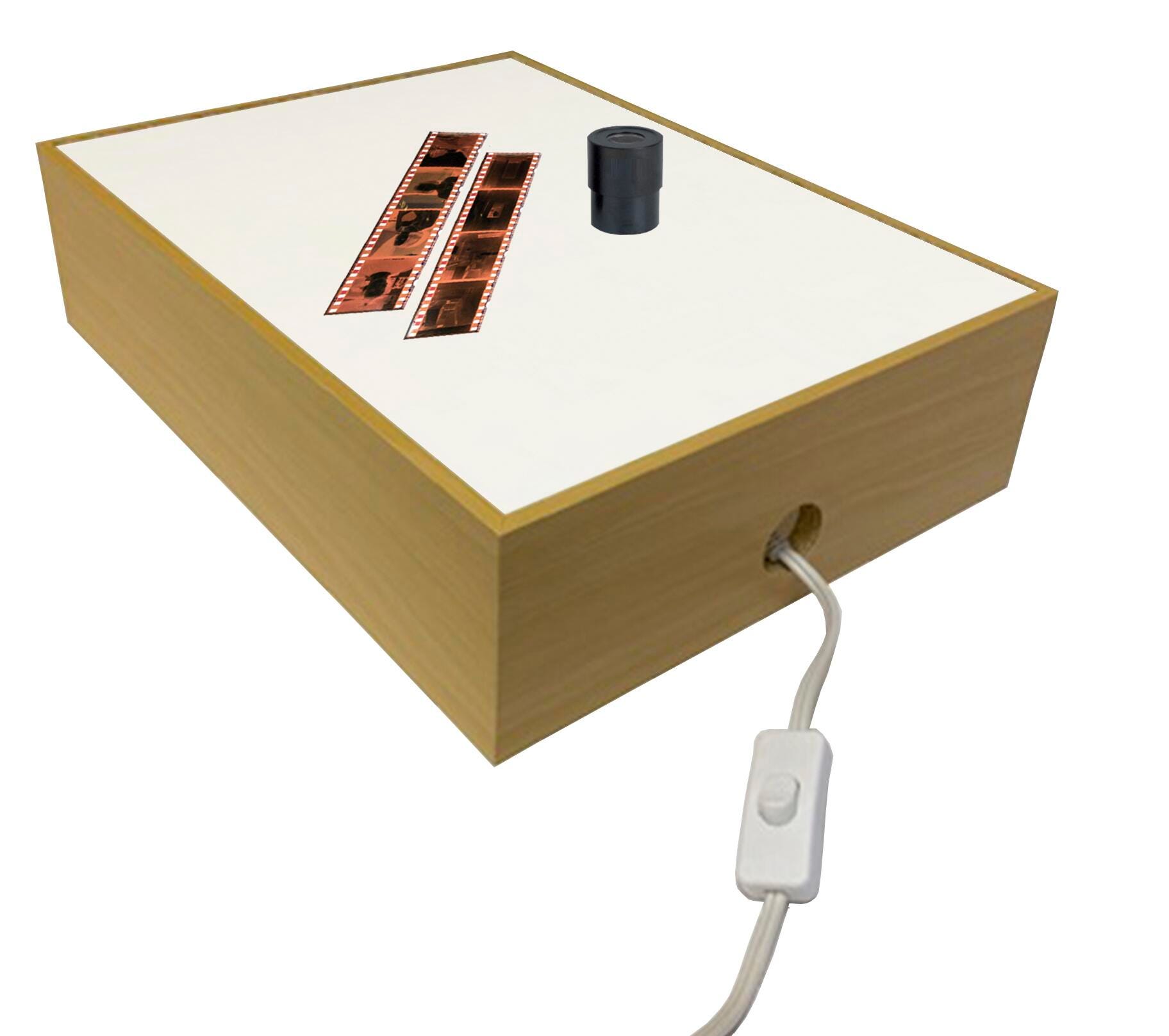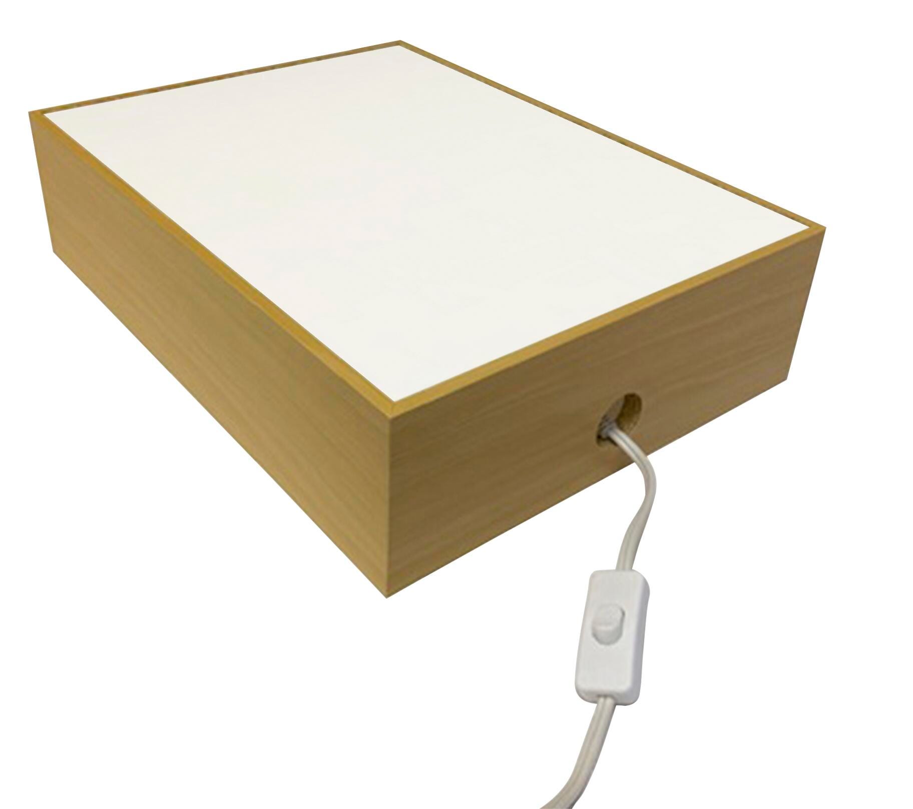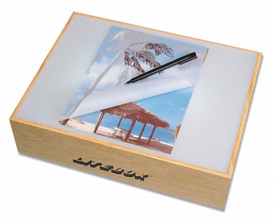 This display lightbox from Inovart features a refined oak-finished frame, U.L.-approved components, an instant on/off switch, and an 8 watt fluorescent lamp that produces cool daylight that is easier on the eyes. Lightbox is designed for tracing, opaquing, stripping, transparency or slide viewing, and sorting. Lightweight and durable. 110 AC.
