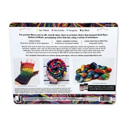 Jacquard Acid Dyes produce the brightest, most brilliant colors possible for protein fibers. These powdered acid dyes are highly concentrated hot water dyes that won't bleed or fade when washed. The versatile dyes can be used for yarn and garment dyeing, or even for painting and printing applications! The vibrant colors can be mixed to produce practically any color in the spectrum, and mixing is easy with the included Color Wheel Mixing Chart. This set includes 4 jars (2/3 ounce each) of dye in the colors yellow, hot fuchsia, turqoise, and jet black.Features