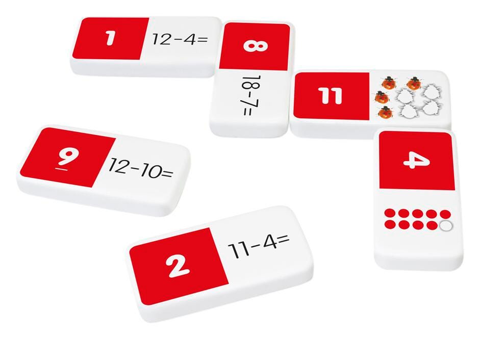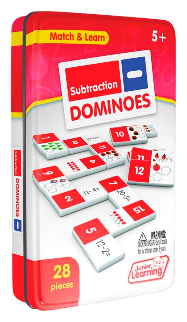 Subtraction dominoes include a 28 piece set on thick plastic dominoes. Children will love the feel of real dominoes as they complete the subtraction matching game. Appropriate for ages 5-10 years old.