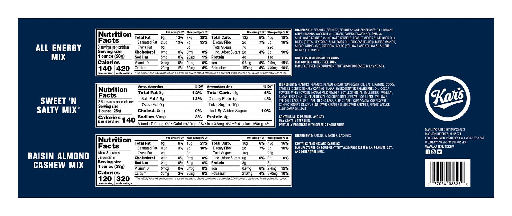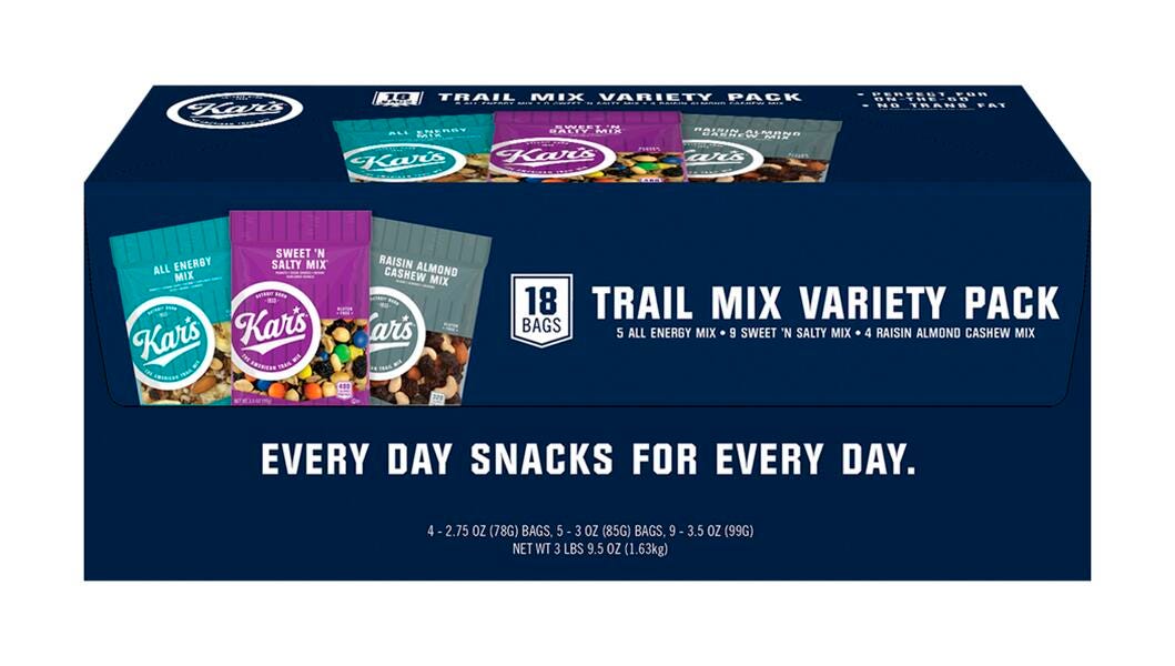 Variety pack offers three deliciously enticing trail mixes to keep you satisfied throughout the day. Each bag provides a great source of energy and does not contain any cholesterol or trans-fat. Sweet 'n salty mix contains chocolate candies, peanuts, raisins and sunflower kernels. All energy trail mix is packed with an unsalted mix of peanuts, banana chips, raisins, sunflower kernels, almonds, dates and mangos. Raisin almond cashew mix consists of an unsalted blend of raisins, almonds and cashews. Variety pack is perfect for keeping in breakrooms, reception areas and kitchens to boost office morale or impress visitors.