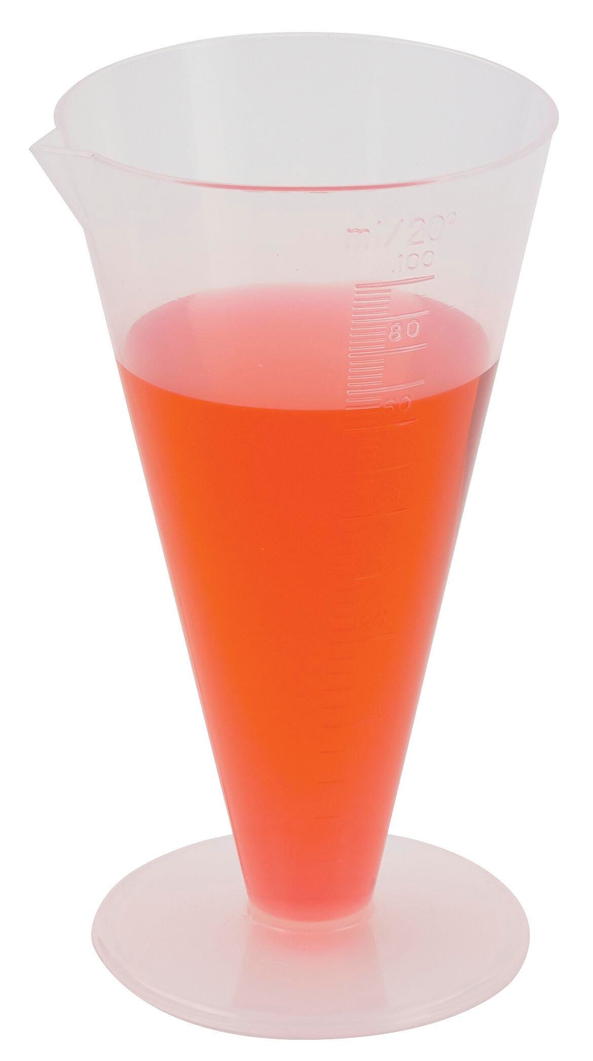 Kartell 100 ml Conical Graduated Cylinder can withstand temperatures up to 121 deg C and polypropylene graduates have a wide base for stability. It is designed for safe grip and is highly resistant to chemicals, sold as 6 per pack.