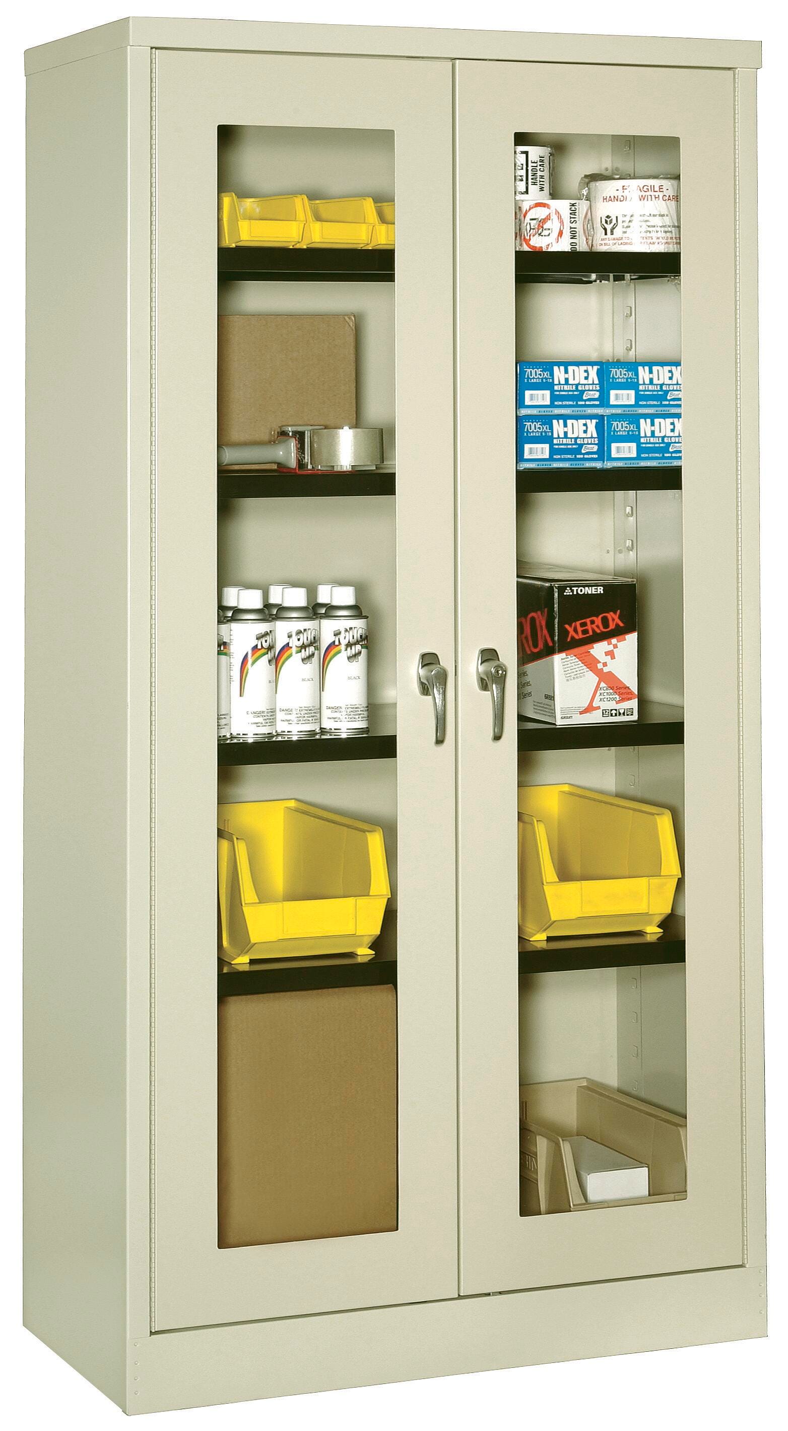 This metal storage cabinet has 16 gauge doors with full-height piano hinges and shatterproof acrylic panels. Doors have two handles (1 locking, 1 fixed), come with two keys, and also have a three-point locking device with plated locking bars. There are 4 adjustable shelves that adjust on 2-inch centers, and 2 base and fixed shelves.Features