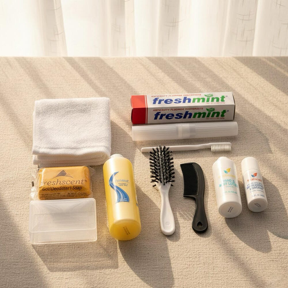 Products come inside a reusable nylon toiletry bag for easy distribution and storage