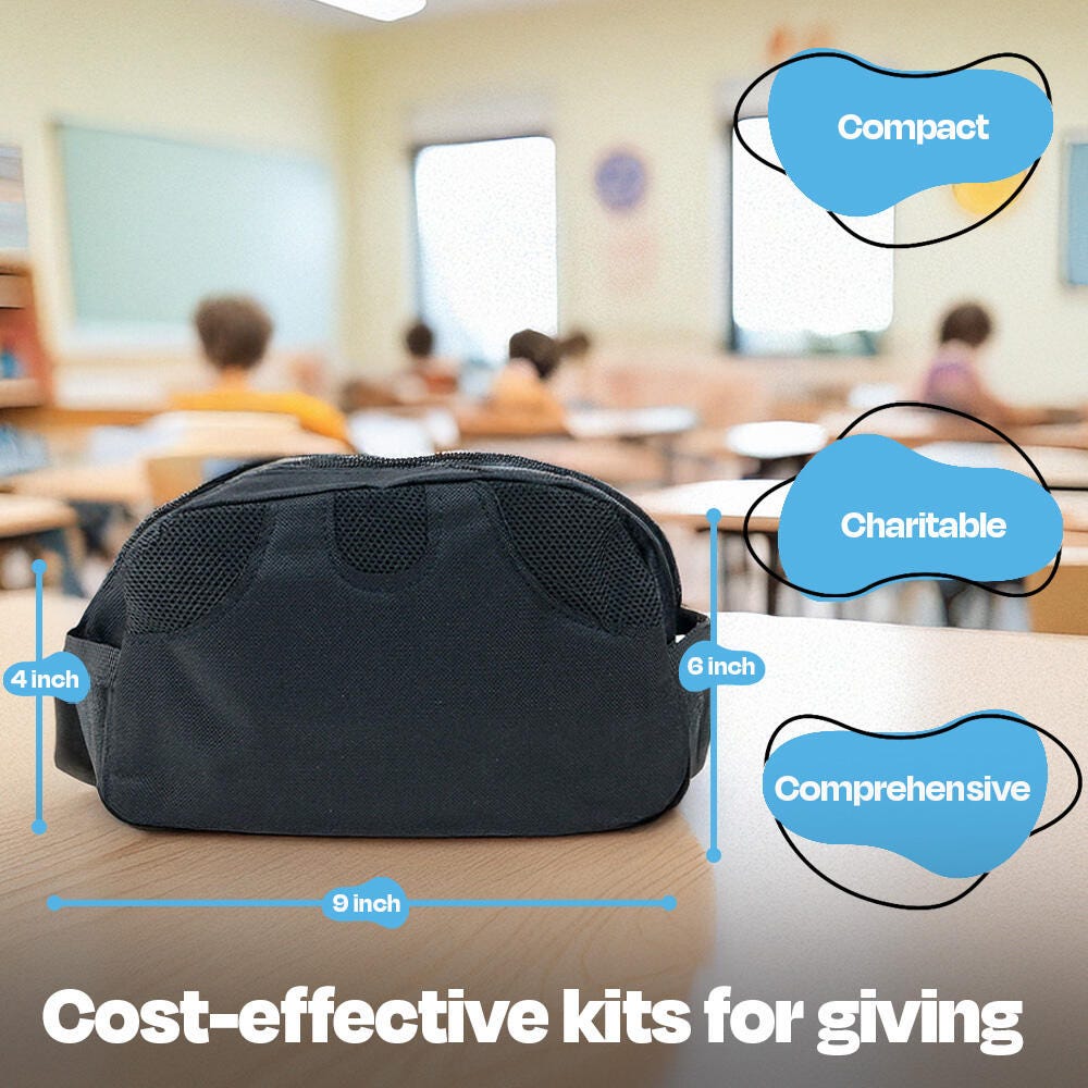 Send a care package of essentials to those in need with preassembled essential supply kits from Kits for Kidz. From basic hygiene items like soap and shampoo to toothpaste, a hairbrush comb, shaving cream, and disposable razors, and beyond, this Adult Hygiene Kit offers an easy and helpful way to provide assistance to children and adults affected by poverty or other hardships. Bag measures 9 L x 4 W x 6 H.