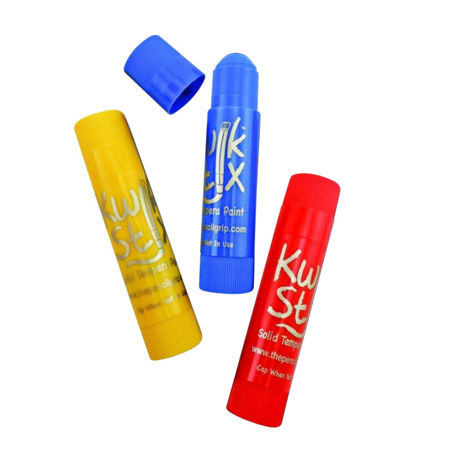Take the mess out of painting while keeping all the fun by putting tempera paint in a solid stick form. Simply uncap, twist and paint! Kwik Stix have a fast drying formula, allowing them to dry within 90 seconds while leaving a paint-like finish. No cups, smocks, water, brushes - or cleanup - required! Kwik Stix offer coverage that won't crack, and are perfect for poster paper, cardboard, wood, canvas and more. Sold as a set of 6 in assorted colors.Features