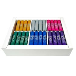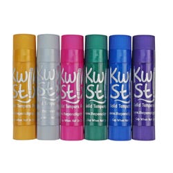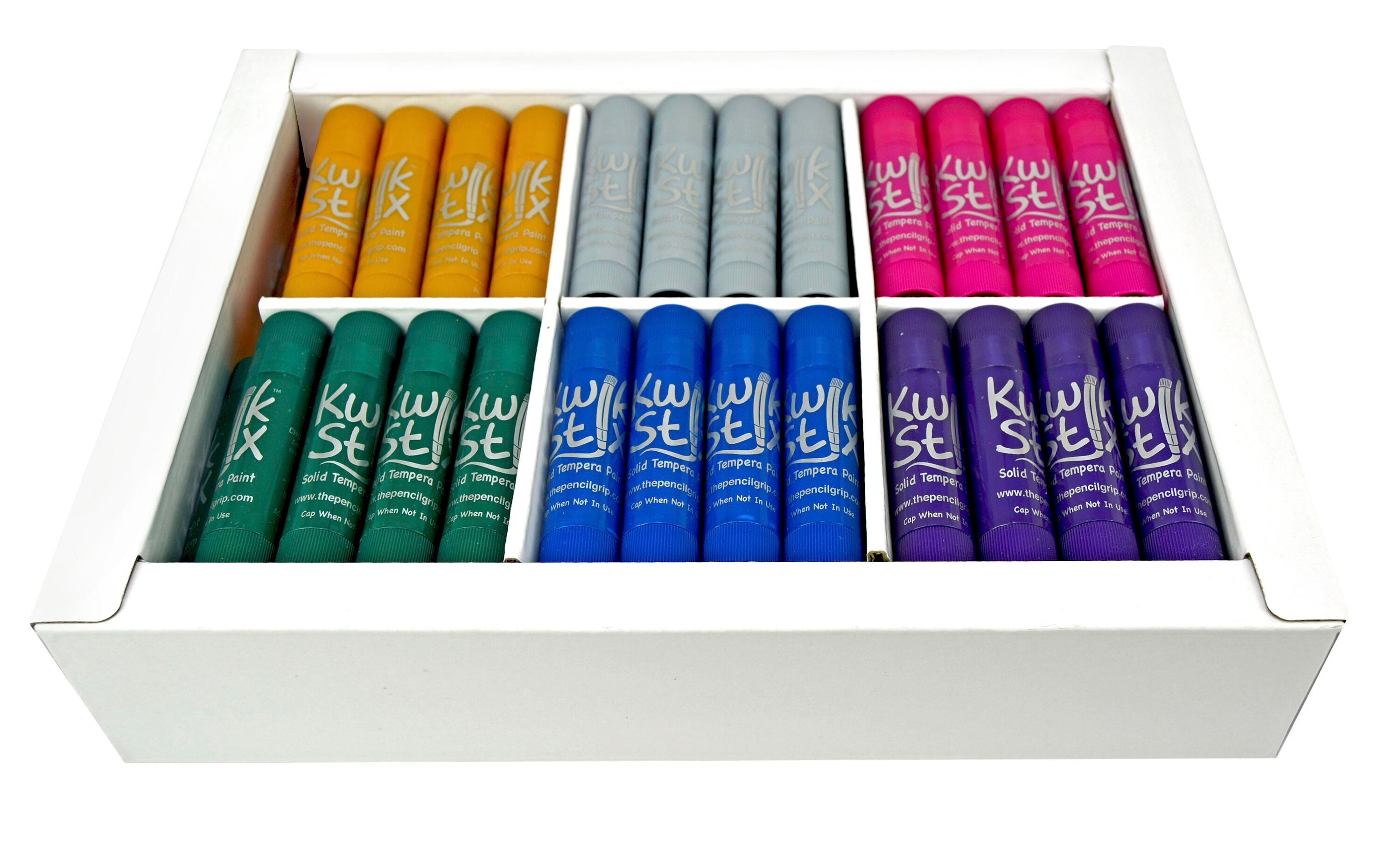 Kwik Stix is a fast drying formula tempera that dries in 90 seconds while leaving a paint-like finish! No cups, smocks, water or brushes are required. Stix come in assorted vibrant colors with nice coverage that won't crack. Great on poster paper, cardboard, wood and canvas. Comes in twelve each in six colors.Features