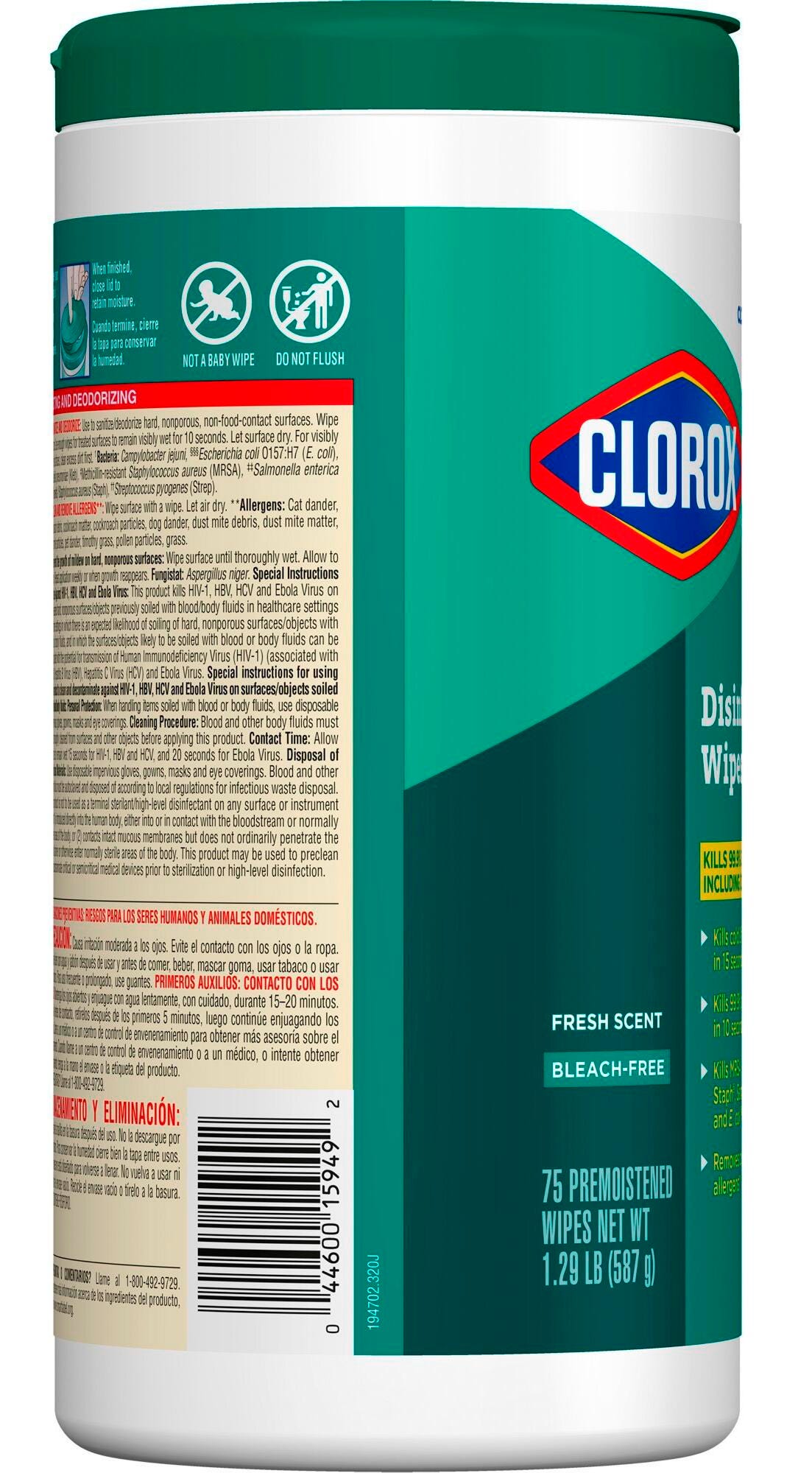 Clorox Fresh Scented Disinfecting Wipe Canister contains 75 wipes featuring bleach-free formula that kills 99.9% of bacteria including staph and salmonella. It is a one-step cleaning and disinfecting solution that is perfect for day care centers, offices, schools and restaurants. Quick, convenient pre-moistened individual wipe for cleaning hard surfaces comes in air-tight canister package that keeps it moist and effective. It is sold as 6 per case.Features