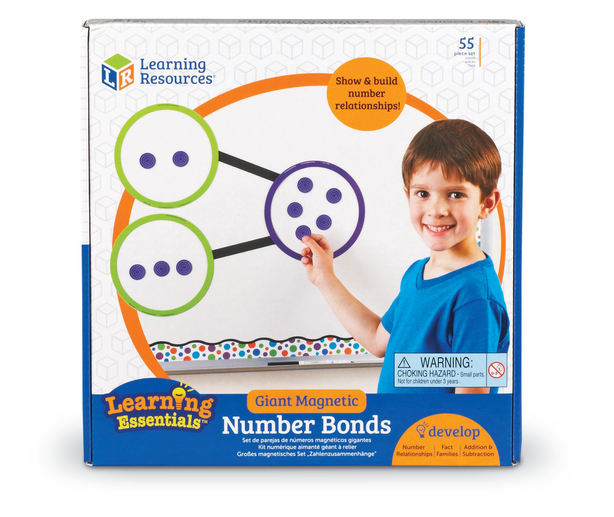 The Giant Magnetic Number Bonds set from Learning Resources is the perfect instructional tool to demonstrate number relationships. This set includes 3 circles, 3 squares, 4 lines, and 45 magnetic discs measuring 1-1/4 inches each. The handy pieces allow you to visually show part/part/whole relationships and fact family fun! The circles are approximately 8 inches in diameter while the squares measure 9-1/2 inches diagonally. This resource is designed for grades K and up.