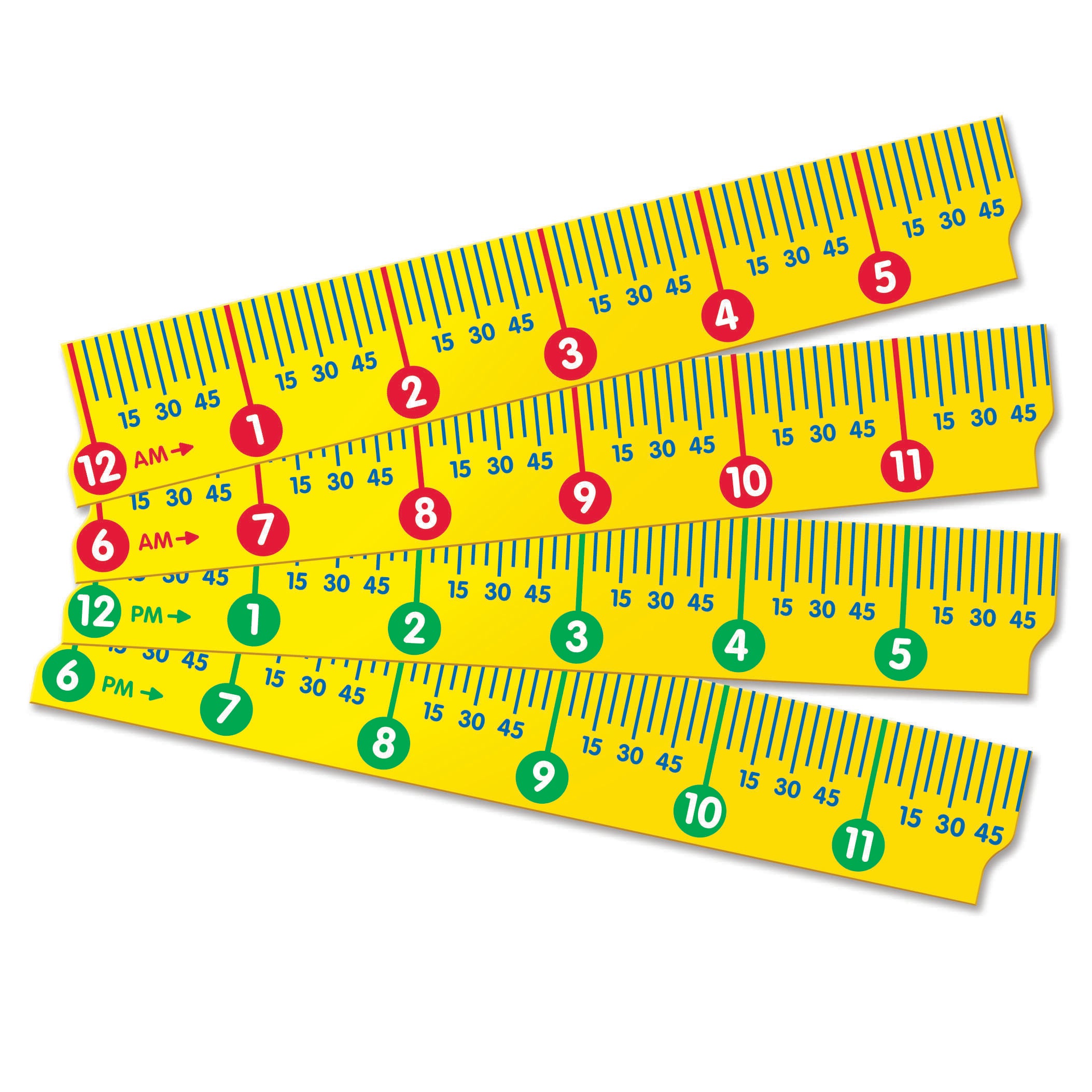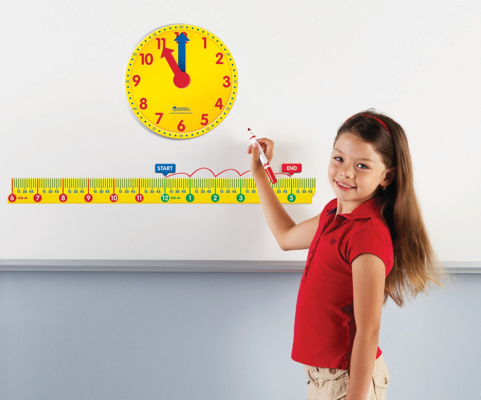Learning Resources segmented timeline helps students understand that elapsed time can begin in the PM and end in the AM. Removable guide numbers support differentiation. Includes 2 magnetic clocks with hands, 24-hour timeline (4 segments), and start and end time arrows. Clocks all measure 10 inches in diameter. Best for ages 7 and above.