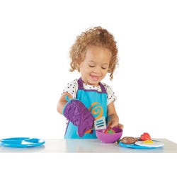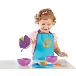 With the New Sprouts Chef Set from Learning Resources, kids prepare for experiences in the actual kitchen with pretend versions of popular cooking tools. After donning their colorful toddler-sized apron and oven mitt, little chefs set about preparing the imaginary eats with plastic accessories including a chunky spatula and spoon. On their own, these interactive accessories help teach kids lessons in social and imaginative skills, as well as introduce language and vocabulary concepts at the core of cooking and kitchen life. Apron, mitt, spoon, and spatula are sized just right for small hands. Cook up a feast of role-play fun!Features