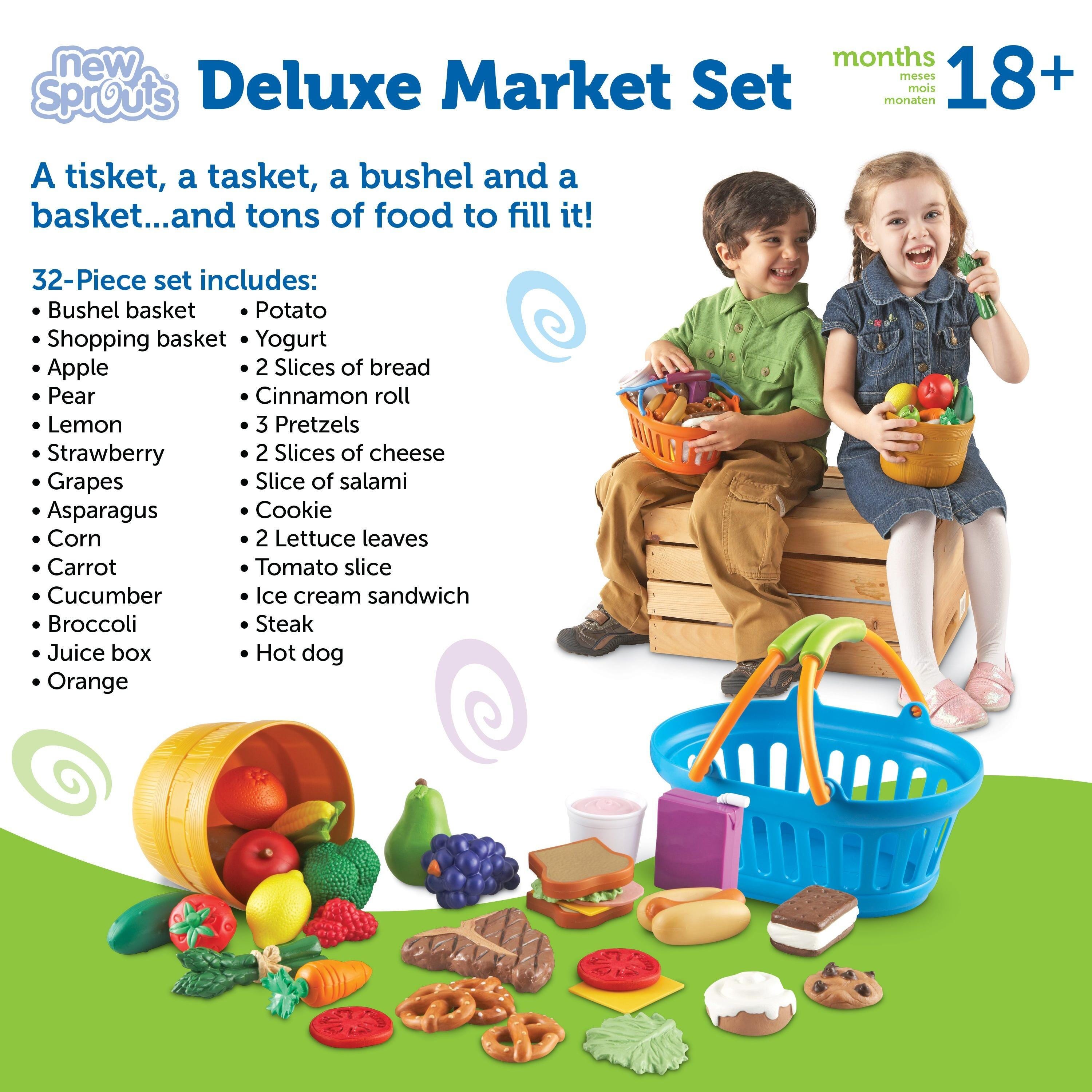 The New Sprouts Deluxe Market Set from Learning Resources is the one-stop food shop for your playroom, classroom, care center, and beyond! Encourage a more realistic dramatic play experience with these 30 pretend play pieces of meats, fresh produce, and other meal essentials. Includes a grocery basket with handles and a bushel basket to offer the perfect storage and carry-all aid for gathering items at pretend supermarkets, farmer's markets, or play kitchens. Set of 32 pieces total (30 food/drink play pieces and 2 baskets). For ages 18 months and up.
