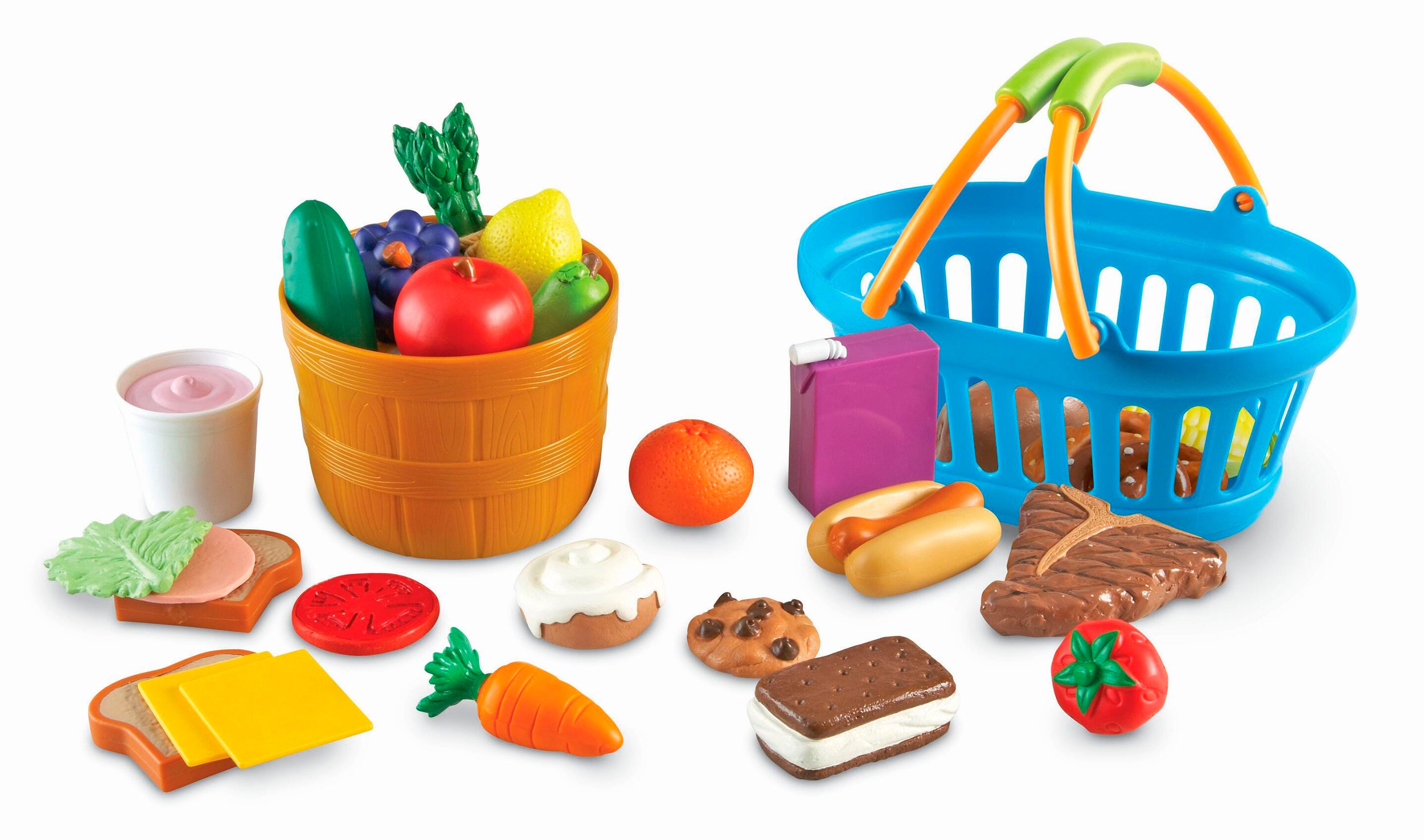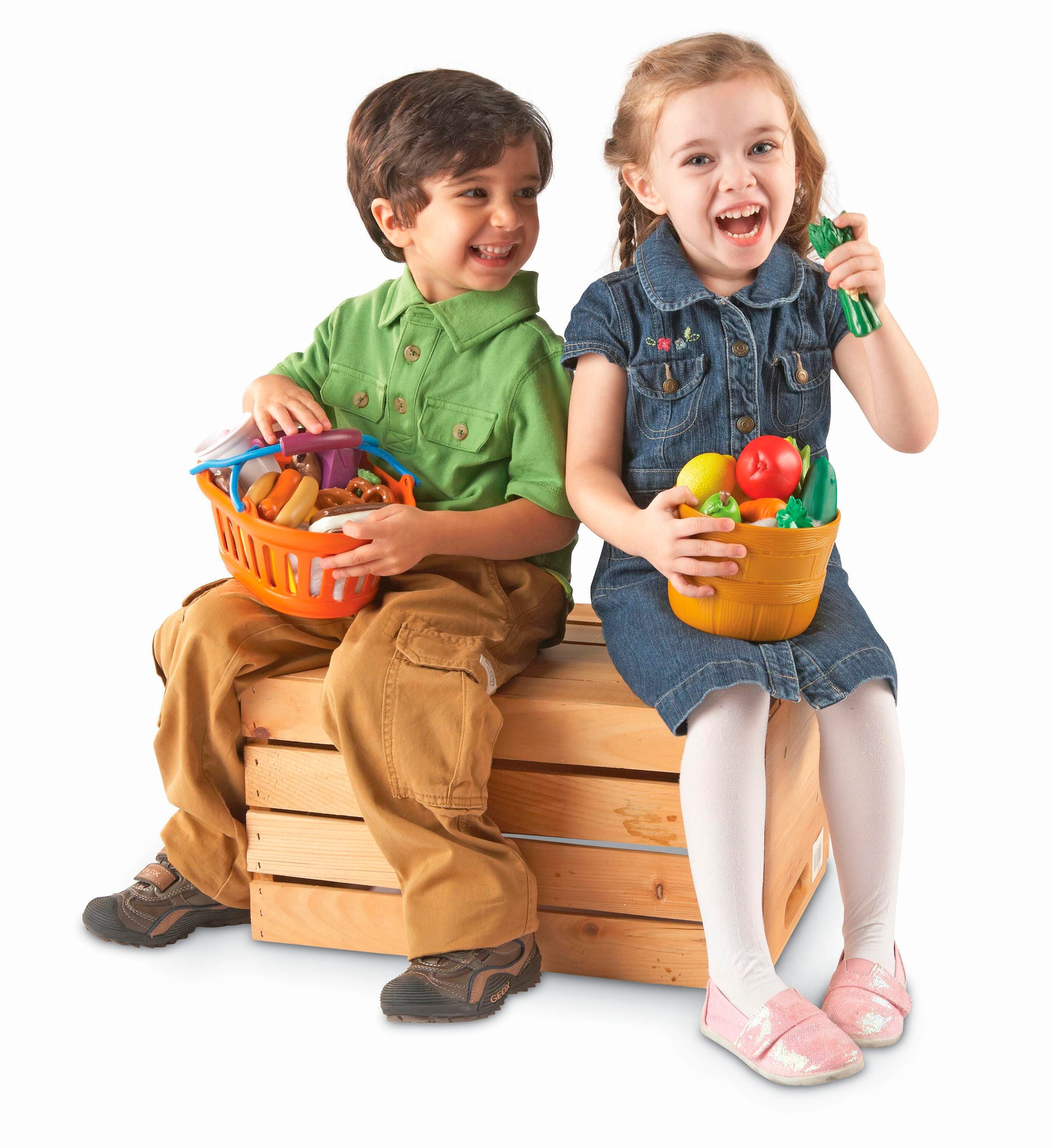 • Included bushel basket and shopping basket with handles offers easy way for toddlers to carry and store all food pieces