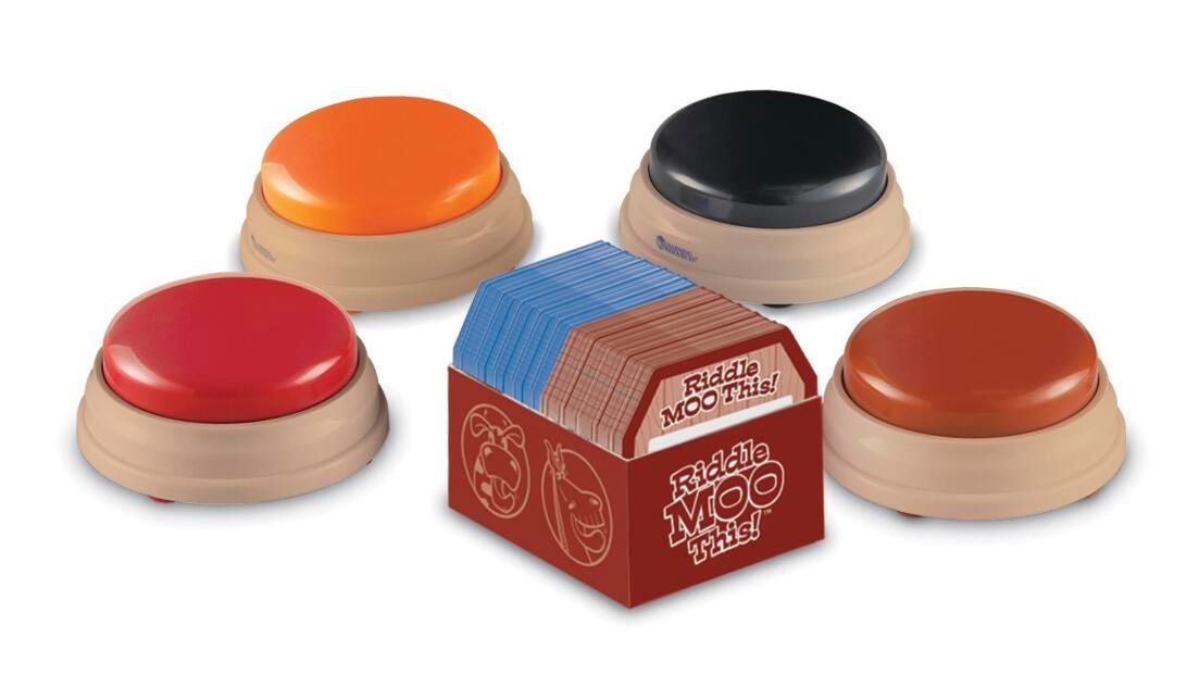 Cock-a-doodle do you know the answer?! Giggle, learn and grow vocabulary with this exciting riddle game! It’s a fruit, it can be red, and it crunches when you take a bite. Buzz if you know the answer! Features 2 levels of game play. Develop Language skills: Students build vocabulary by identifying words based on a description and advanced game play involves critical thinking and expressive language skills to change one clue on the brainteaser card to create a new answer to the riddle. Develop Social & Behavioral skills: Encourages peer interaction, turn taking, socialization and laughter. Patience and waiting may also be practiced when remembering the appropriate time to hit the buzzers! Includes 4 animal sounds buzzers and 150 double sided cards. For 3 or more players. Ages 5 and up, Grade K and up.